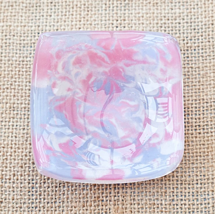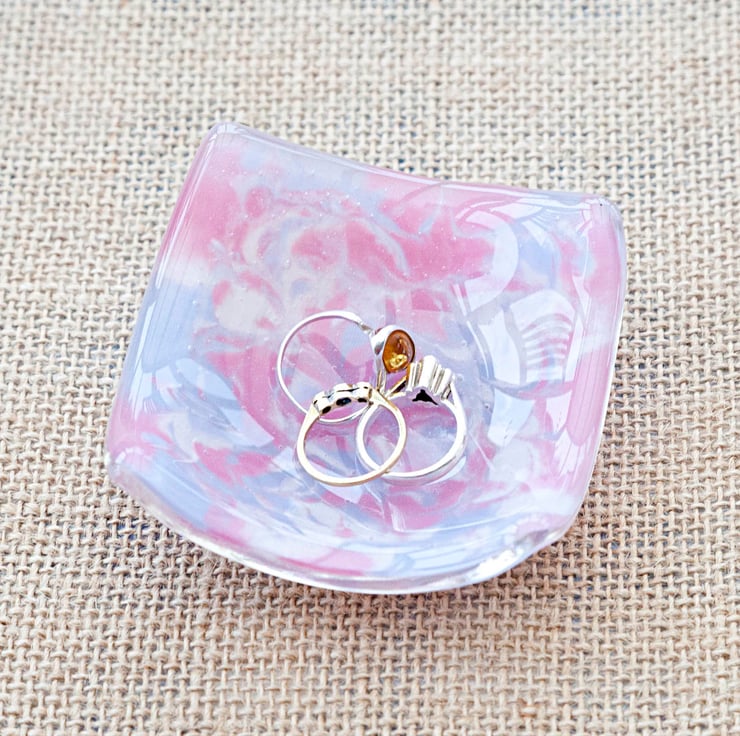 A pretty little handmade slumped glass dish with marbled pink, purple and white colours. This dish can be used for a variety of things from dipping sauces to holding jewellery items to being a tealight holder.