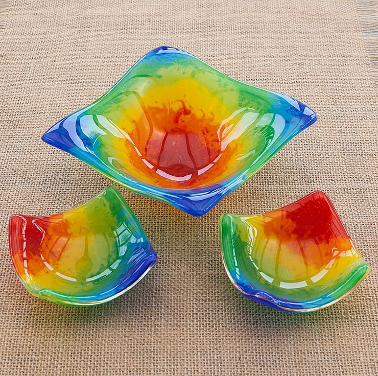 All items are handmade by myself in my home workshop, the glass is layered and then fired in a kiln in order to fuse the layers together. Because each item is handmade they will all be slightly different.