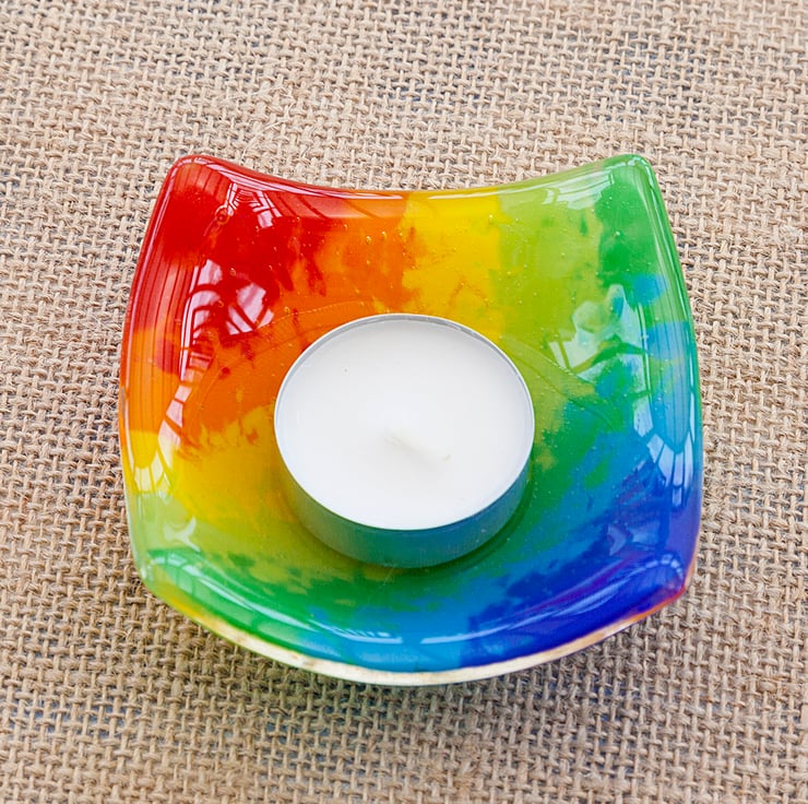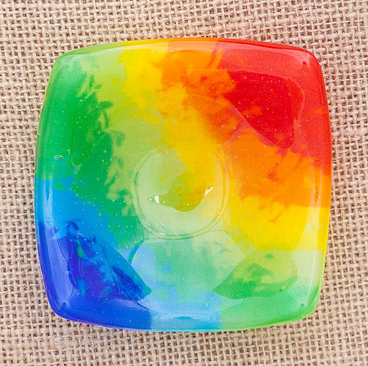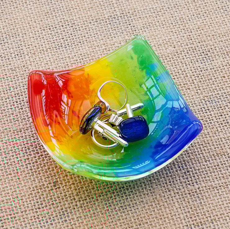 A cute little handmade glass trinket dish with a watercolour-style rainbow pattern. The colours have been created using powdered glass and moved in such a way that created a bit more blending than is possible with sheet glass. This bowl is beautiful and function. It can be used for a variety of things such as a tea light candle holder, jewellery dish, condiment dish or any number of other uses!