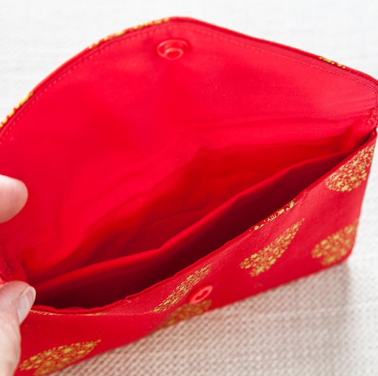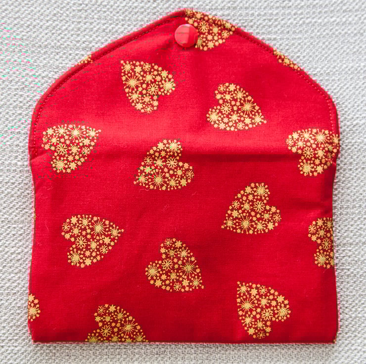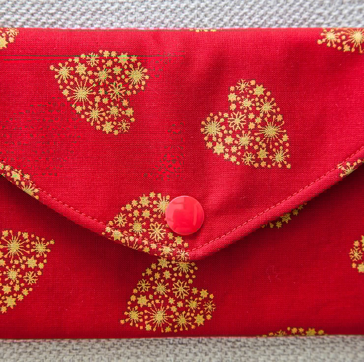 This pretty padded pouch in a lovely red fabric with gold hearts is perfect for protecting your mobile phone in your pocket or bag. It can also hold that essential make-up you always want with you on a night out, tissues, credit cards or keys. A lovely glamorous accessory perfect for the evening or a night out.