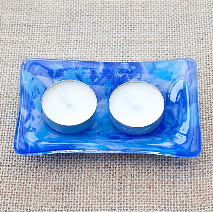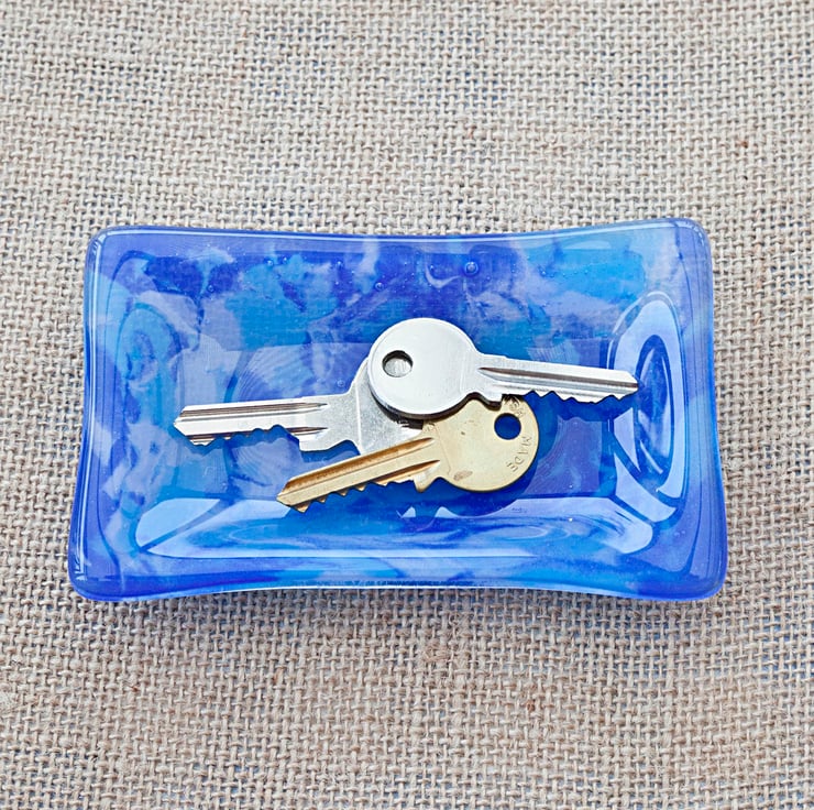 A beautiful blue marbled fused glass trinket dish. The watery blues have been created by applying wet powdered glass to a layer of sheet glass then swirling the different colours around. It is then melted in a kiln to fuse all the layers together before going in for a second firing to slump the dish.