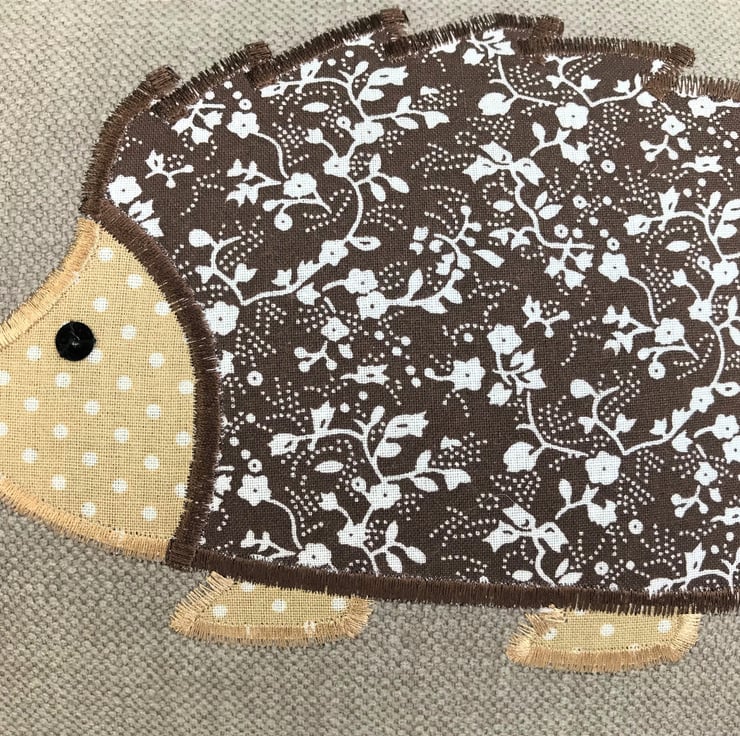 A rectangular cushion in a taupe fabric with an applique hedgehog and two toadstools. The main body of the hedgehog is made from dark brown fabric with a white ditsy floral print. The head and feet are made from beige fabric with white polka dots and the hedgehog has a black sequin eye and nose. The toadstools are made from red fabric with white polka dots and have stems of cream fabric with tiny brown flowers.