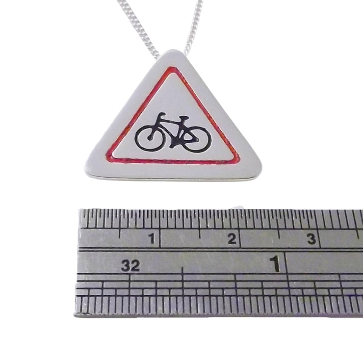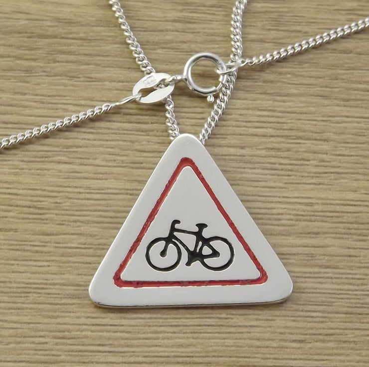 This cycling road sign pendant has been lovingly handmade in Shropshire. It is crafted from sterling silver sheet and is etched before being cut by hand, the edges are then smoothed using files and emery paper. A 5mm oval jump ring is then attached. Black and red resin based enamels are added to the etched areas and then the pendant is polished before being attached to a chain.