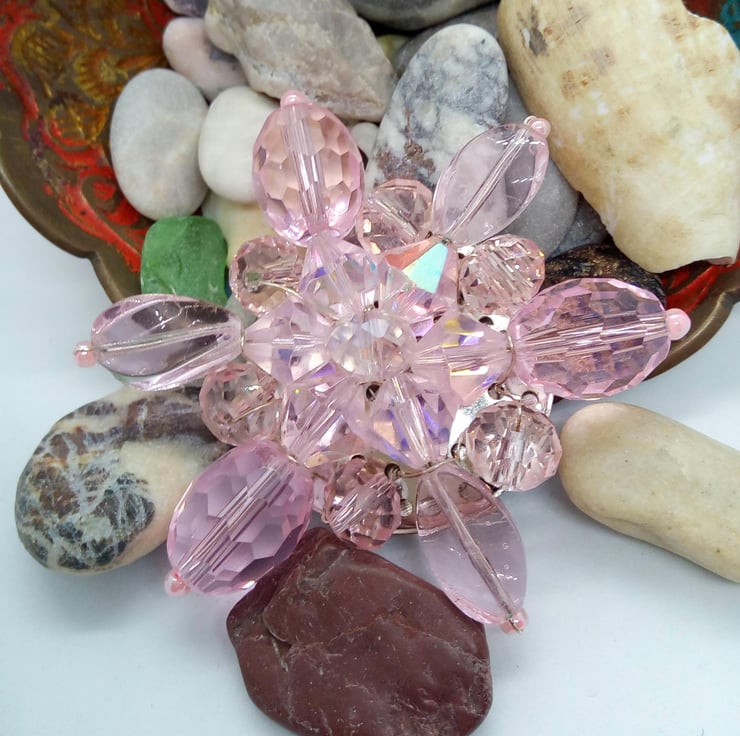 Ladies Pink Crystal Beaded Flower Brooch