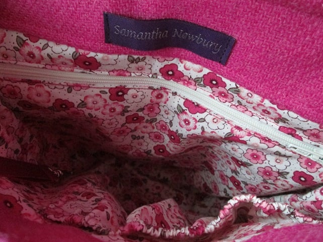 Simple, but very stylish, the bubblegum pink body of the bag, sets off the pink, purple, grey and teal stripes of the strap and flap. I've lined the strap with matching pink Petersham ribbon, and used a pretty floral cotton for the interior.
