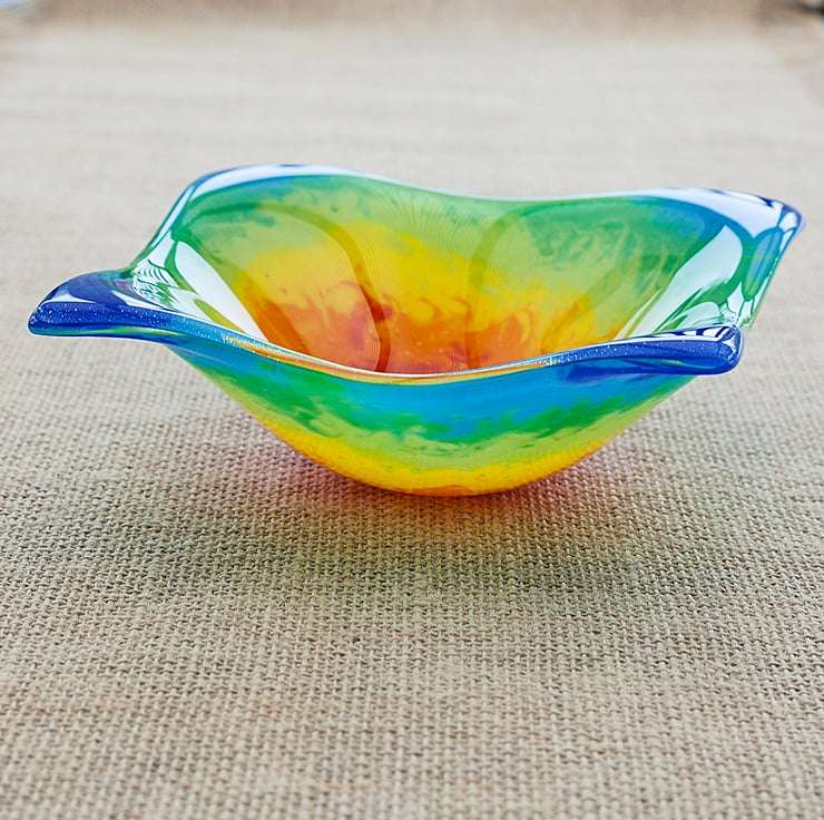 A beautiful, organically shaped rainbow coloured bowl. The colours have been created using powdered glass and moved in such a way that created a bit more blending than is possible with sheet glass. This bowl is a statement piece that will brighten any room and can also be functional as a snack bowl, candle holder, jewellery dish, or any number of other uses!