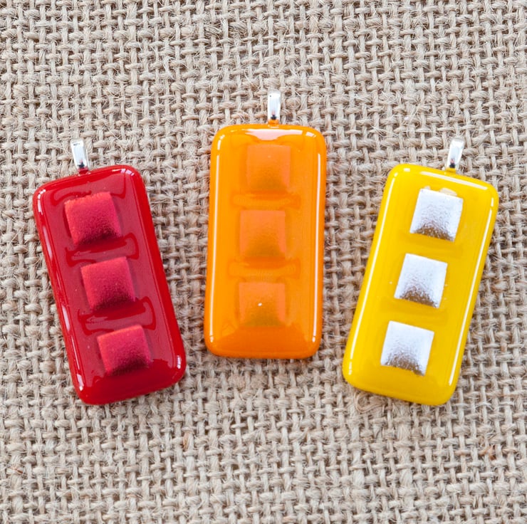 A eye-catching, brightly coloured orange glass pendant. It's been cut by hand, layered with three red dichroic squares to add that extra bit of sparkle, then fused in the kiln.