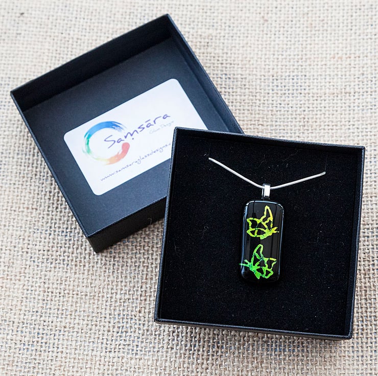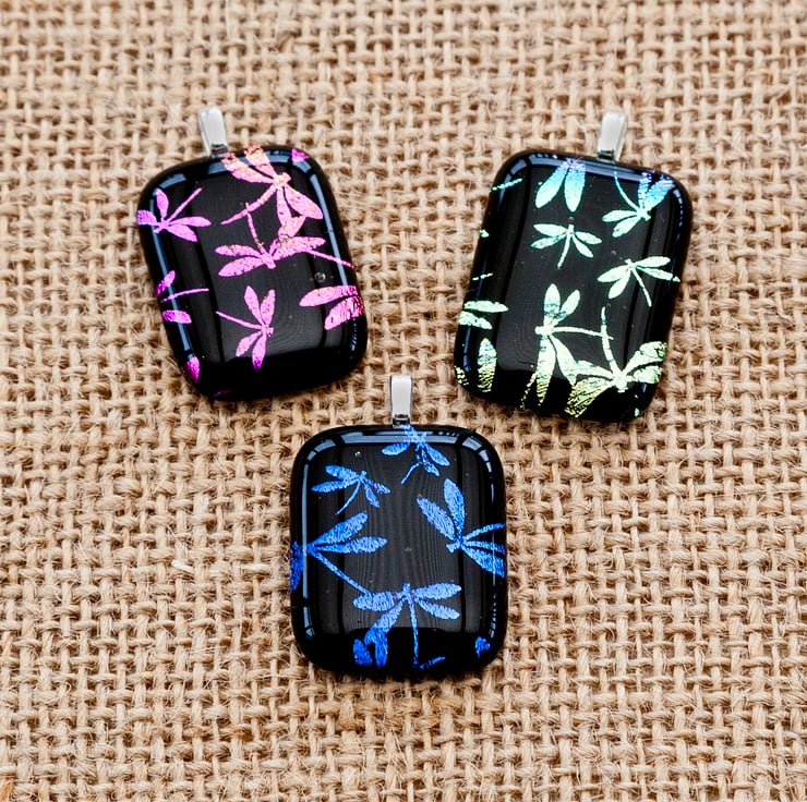 A beautiful and eye-catching handmade dichroic glass pendant with a multi-coloured dragonfly design. This one changes from pink to purple when tilted at different angles. Please note the pattern and colour may not be exactly the same as shown in the picture.
