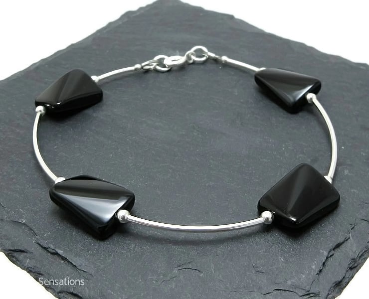 Glossy Twisted Black Onyx Oblongs Bangle Style Bracelet With Sterling Silver