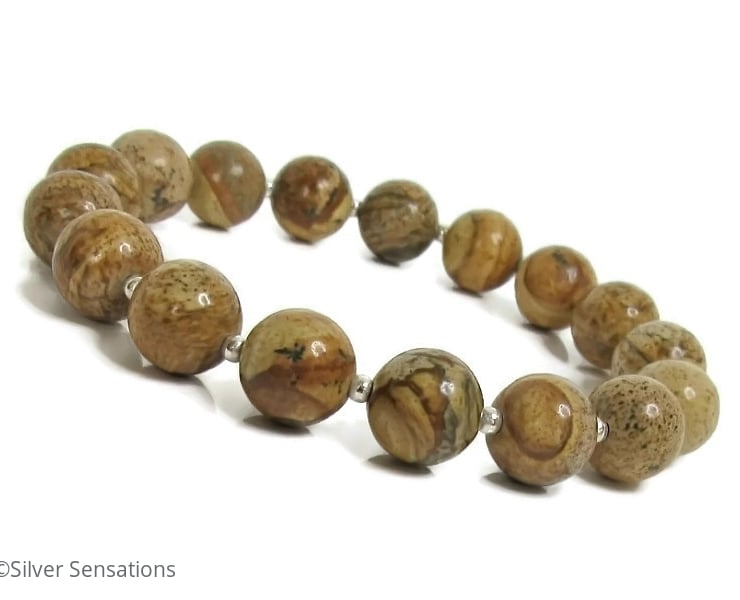 This brown easy to wear stretch bracelet has 10mm round Picture Jasper beads.