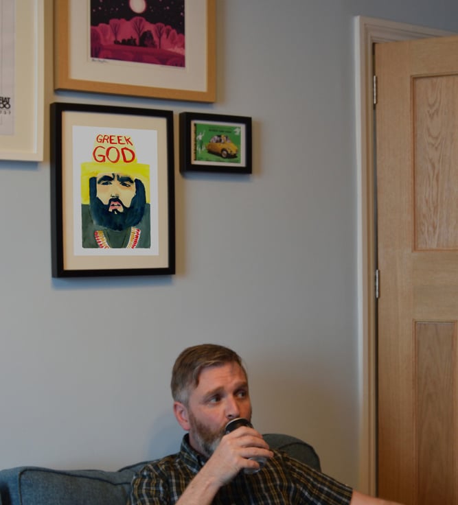 That's me underneath him, having a beer. I thought, "How can I find an excuse to do some daytime drinking? I know, I need a prop for my photo!"