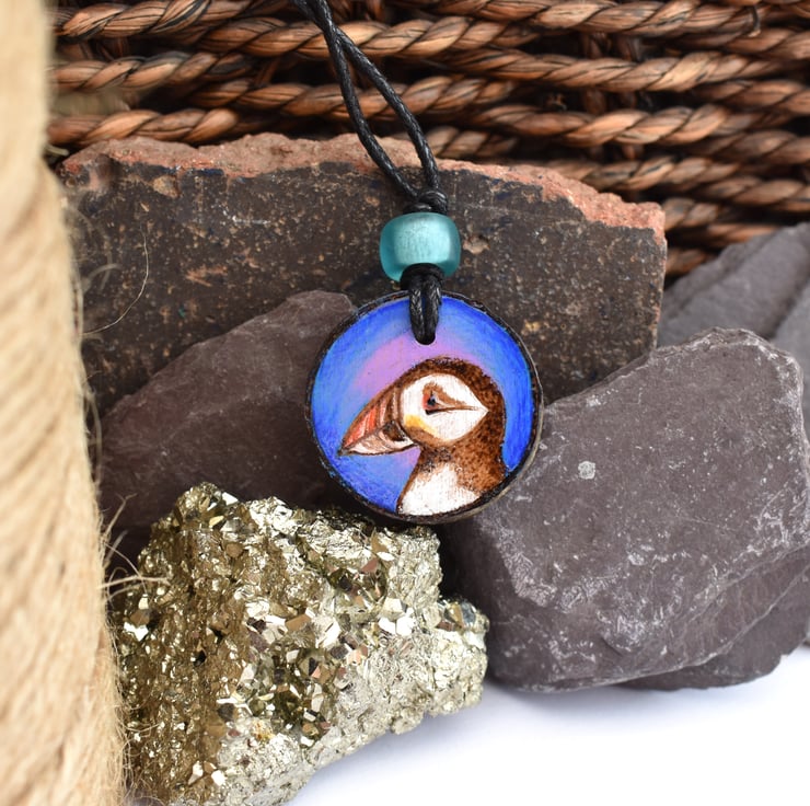 A bright hand burned rustic pendant, with a cute puffin face. This is one of my smaller, lightweight pieces. Ideal for a lover of puffins! A lovely gift for a birthday, or for a five year wood anniversary.