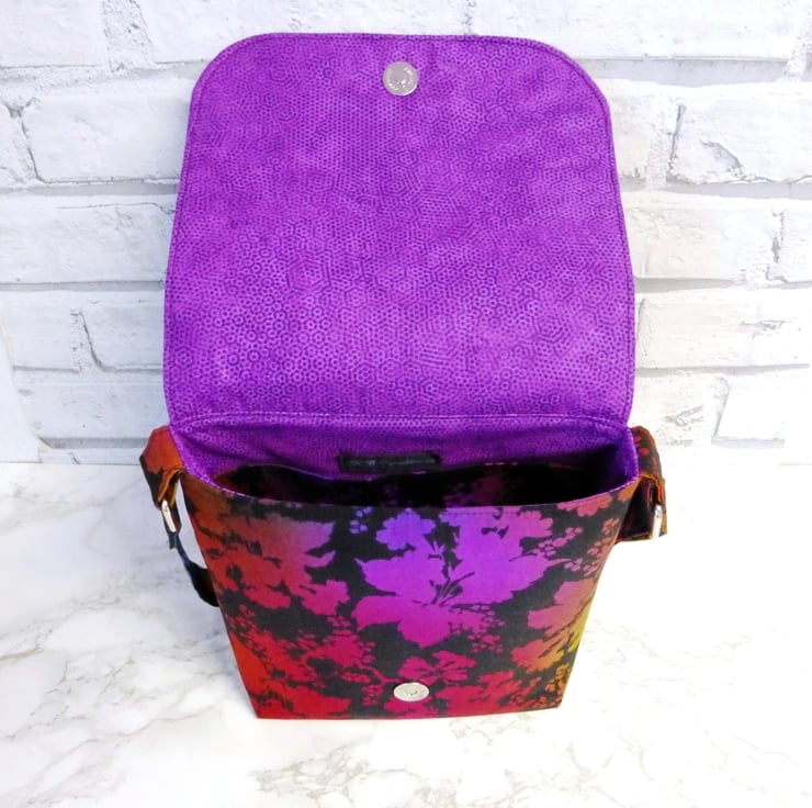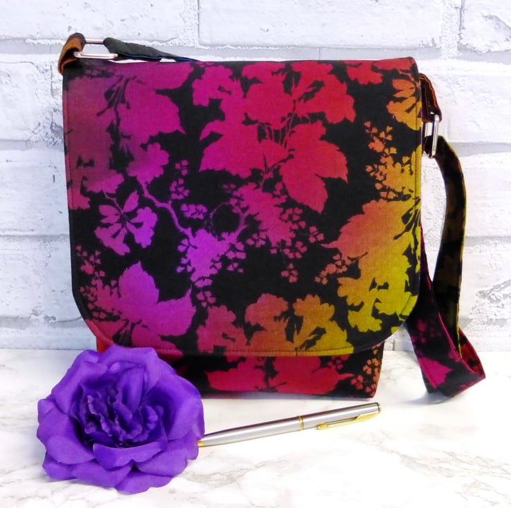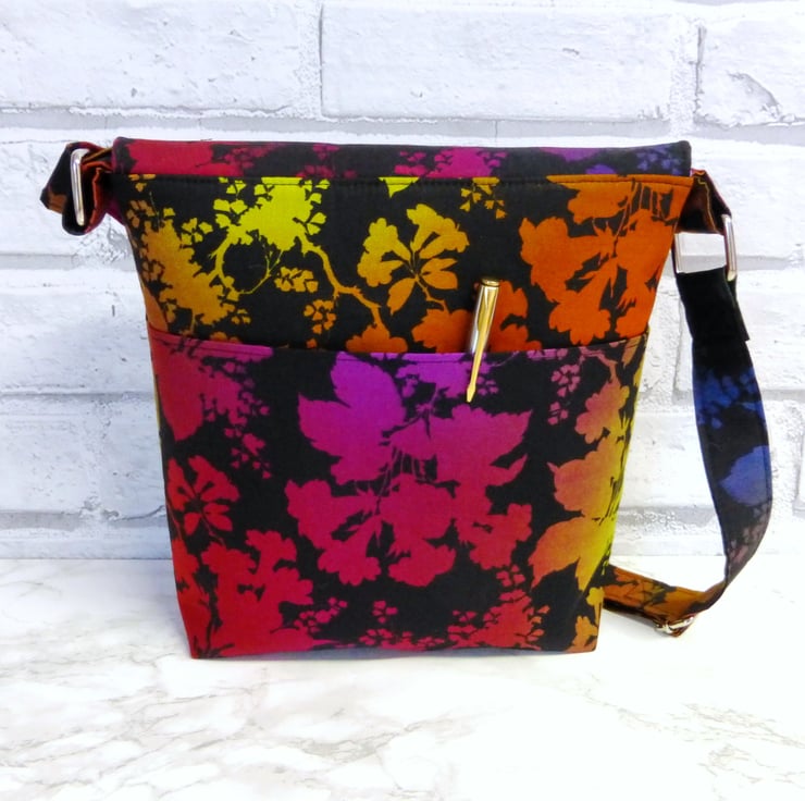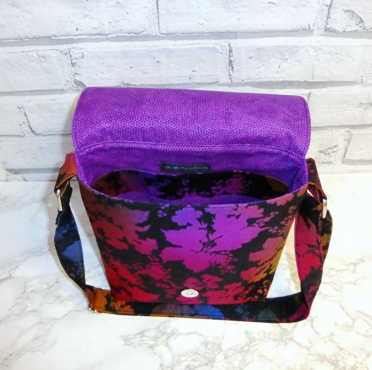 This Messenger style handbag is made from 100% quilting weight cotton in a black cotton fabric with a multi coloured leaf and flower design in shades of purple, pink, orange, green and blue. It has been backed with fusible fleece to give the bag some body. There is a full width slip pocket on the back of the bag.