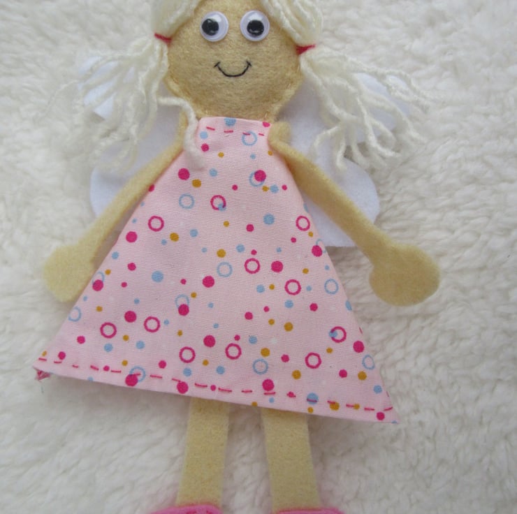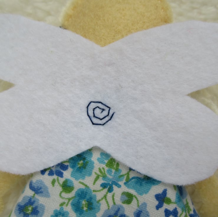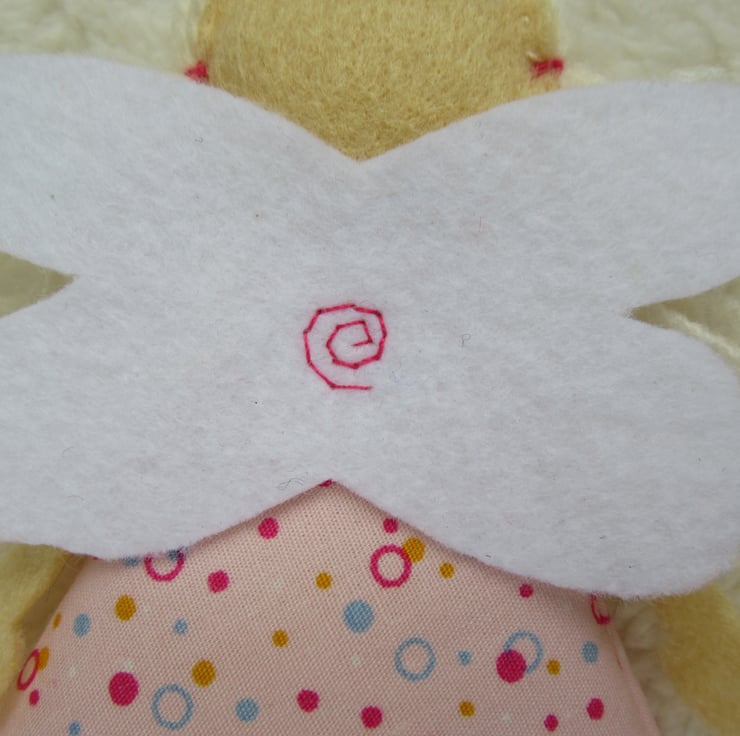 The head of each fairy is lightly stuffed. There is a silver thread hanger and she has cute googly eyes, giving lots of character. The blonde hair is acrylic wool.