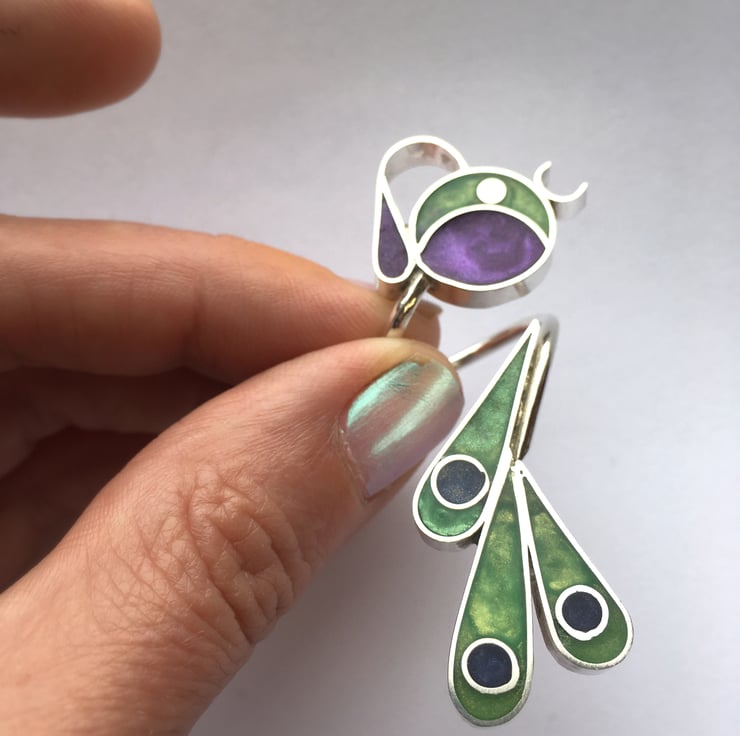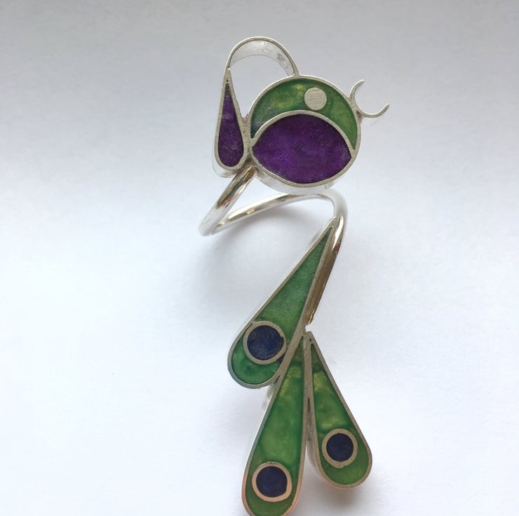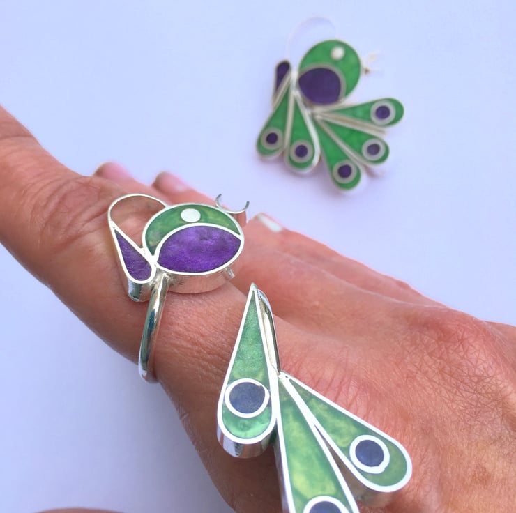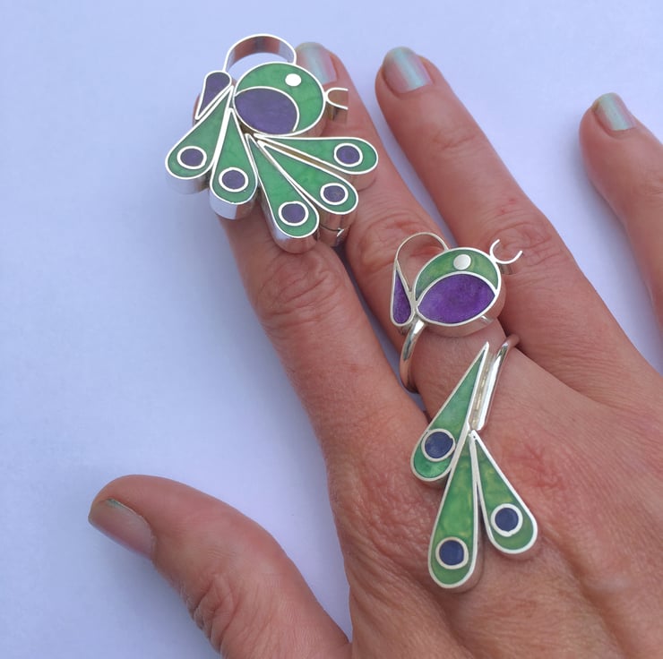 This statement Peacock ring is made to order in hallmarked sterling silver using hand cut strips of metal that are then formed and soldered individually onto a base, then each section is painstakingly filled with hand mixed coloured resin that is polished to a shiny finish.