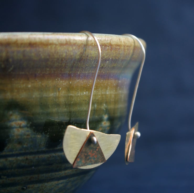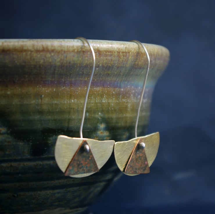 I have cut out pieces of brass into rough semi circle shapes, with a diameter of 24mm/ 1 inch, and give them a matt surface texture . There is a small copper 14mm/half inch wide triangle hanging to the front . This has undergone a process of patination to produce dark green colours within the copper colours.