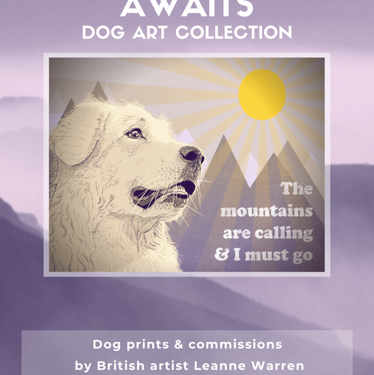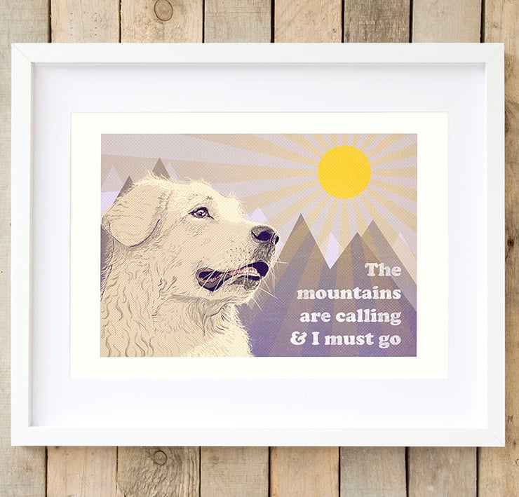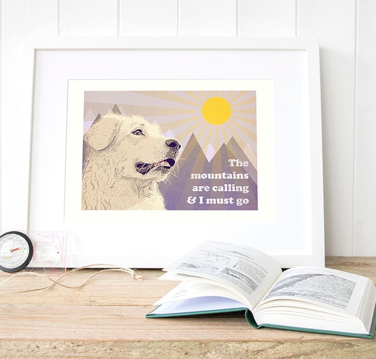 This Pyrenean mountain dog (or Great Pyrenees) wall art print features the famous John Muir quote 'The Mountains are Calling and I must go' and is primarily created in complimentary colours of purple and yellow.