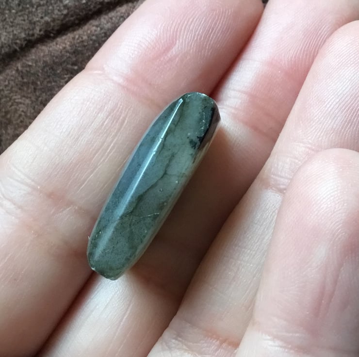 This very pretty Cabachon of blue grey Labradorite has lots of inner blue and golden fire and light play, which catch the light beautifully and would make a fantastic focal centre piece in a necklace. Lighter from differing angles. Deeper colours from other angles.