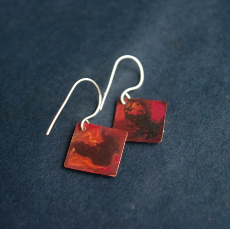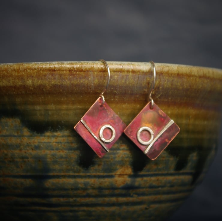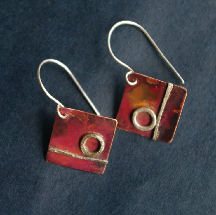 I have soldered a silver circle and silver line onto 15mm square pieces of copper . The copper has gained rich shades of red, orange with areas of black as a result of heat , resulting in an unique copper abstract background . The colours protected by impregnating wax and are brighter in light.