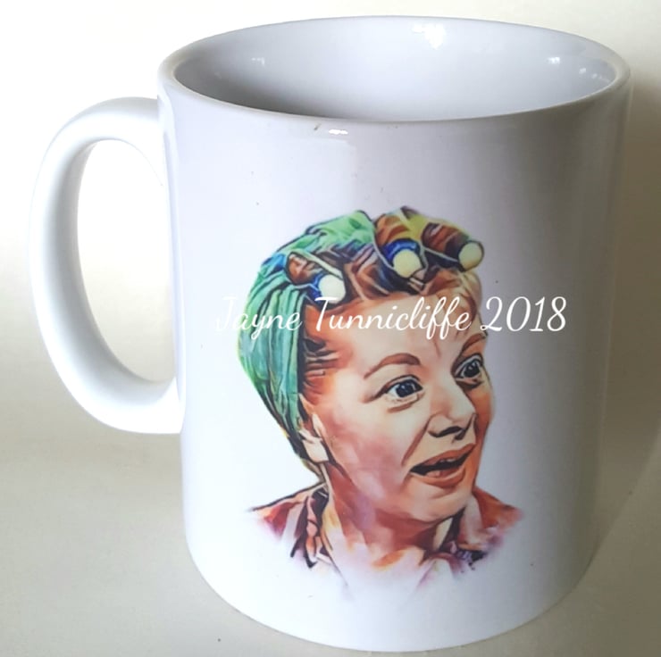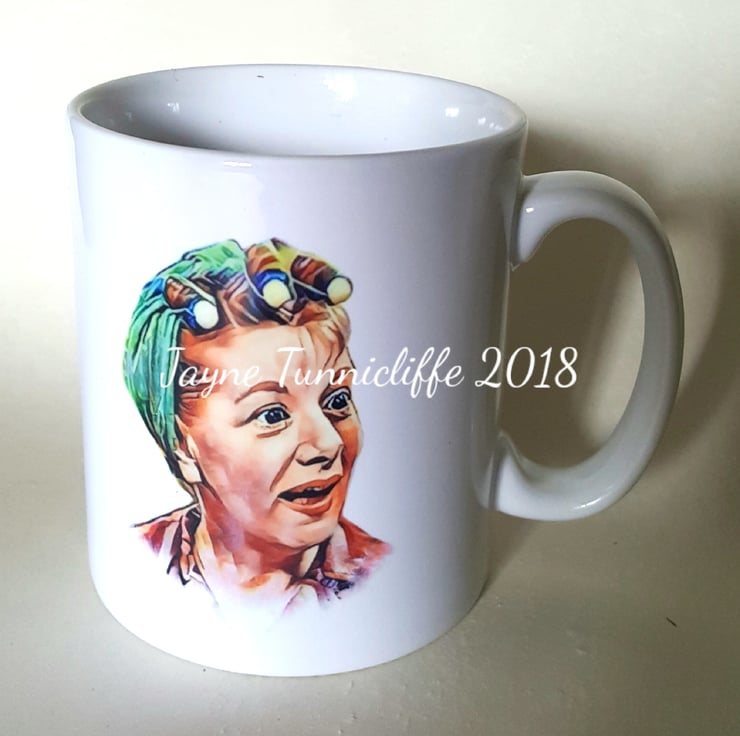A lovely ceramic mug/cup featuring Hilda Ogden (Jean Alexander) from an original painting by Jayne Tunnicliffe.