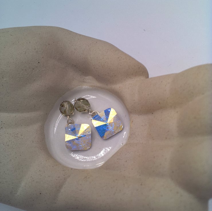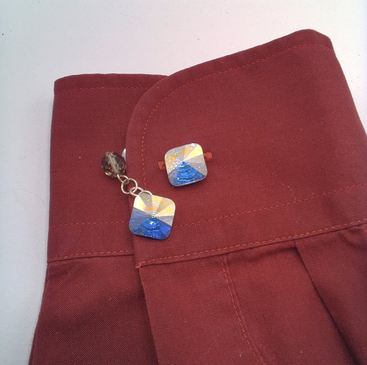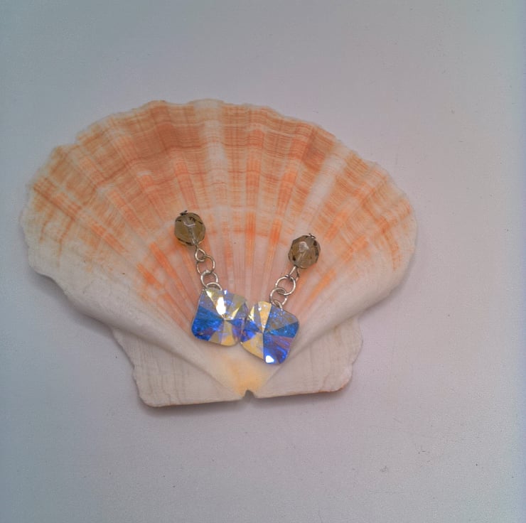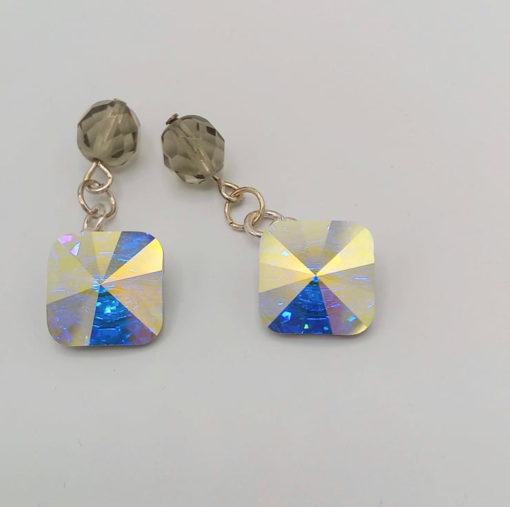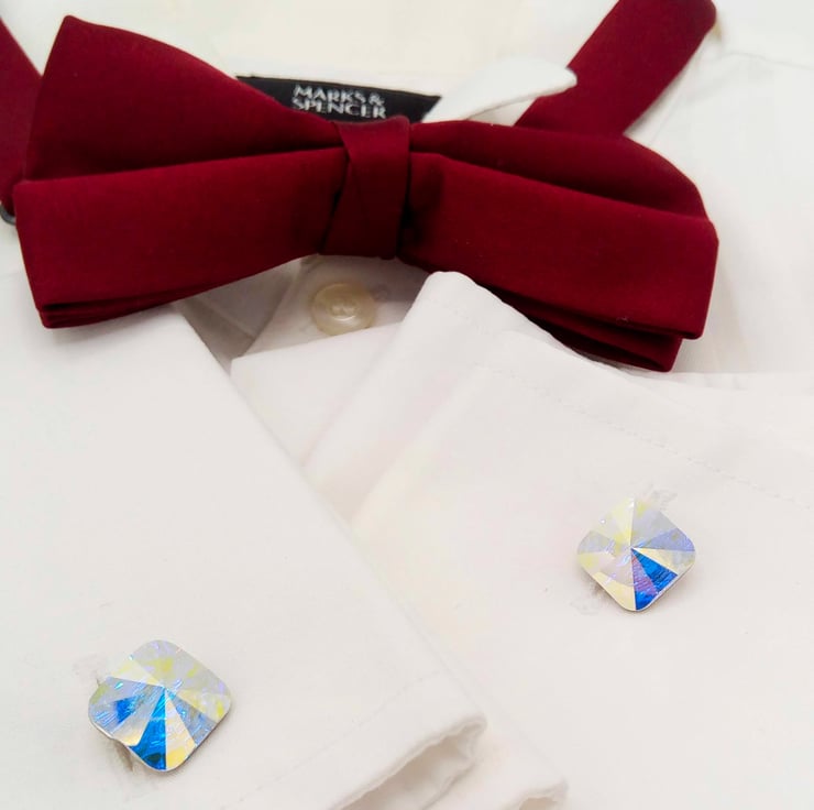 This formal pair of cuff links for either a man or lady would make an ideal Birthday, Fathers Day or Christmas gift for someone special. They would be the special finishing touch to any shirt for a wedding or party, or for everyday wear. The cuff links are made using 12 mm square crystal buttons in clear with a blue fleck and 8 mm faceted smoky quartz crystal beads. Both beads are held on piece of chain 10 mm long to pass through the button holes. All metal components are silver plated. The cuff links will be dispatched wrapped in tissue paper in an organza bag and delivered to you via Royal Mail first class post. As the set up of computer monitors varies the colour shade shown of these stones may vary.