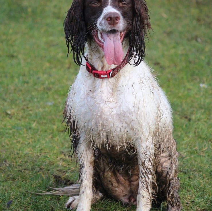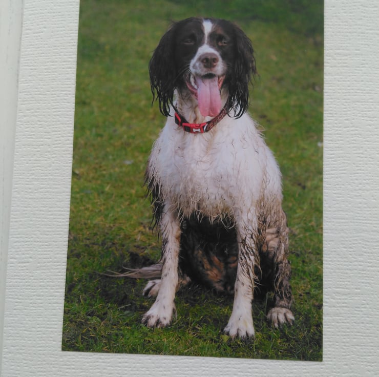 6" x 4" photo mounted on white textured card, with a blank inner, of a wet, & bedraggled Spaniel with it's tongue out, panting, after chasing it's ball.