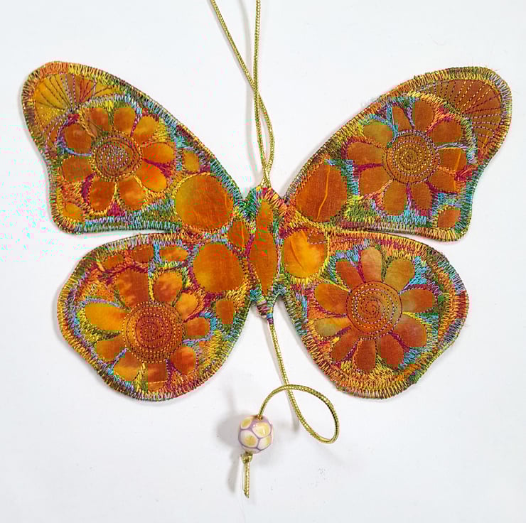 This is a handmade machine stitched fabric hanging butterfly decoration.