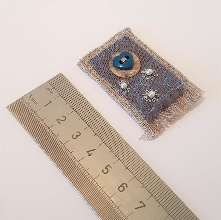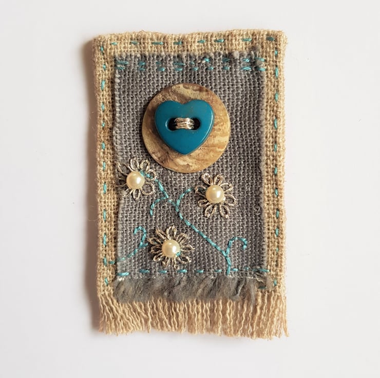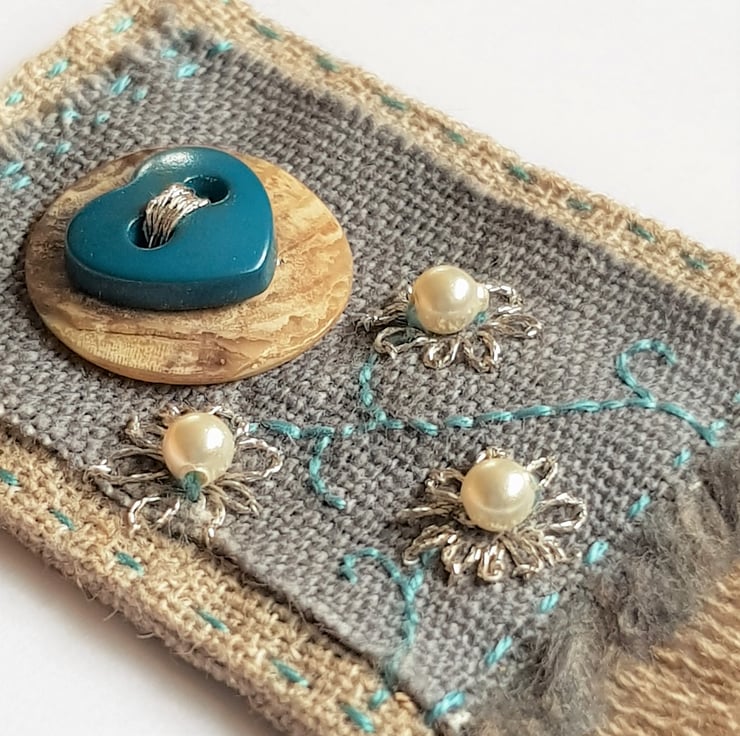 This is a pretty little fabric brooch that I have designed, hand sewn and hand embroidered. It is lightweight and embellished with two gorgeous buttons alongside some white/cream Swarovski crystal pearls.