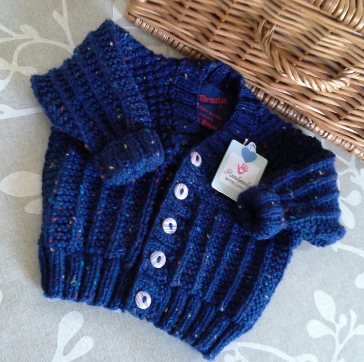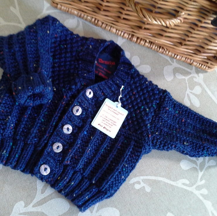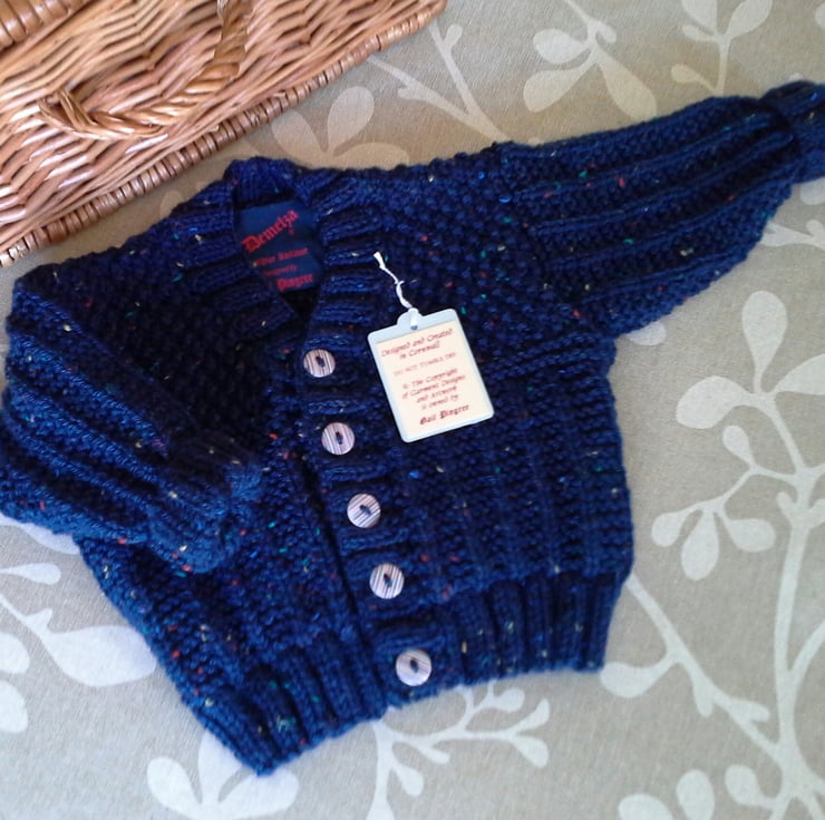 A very sweet practical baby boys jacket ideal for everyday wear. The yarn used is a branded premium acrylic with multicoloured slub within it. It has genuine wooden stripe effect buttons to compliment it and the item is machine washable on a delicate setting. The designer branded garment label is attached to the back neck edge as proof of its origins.