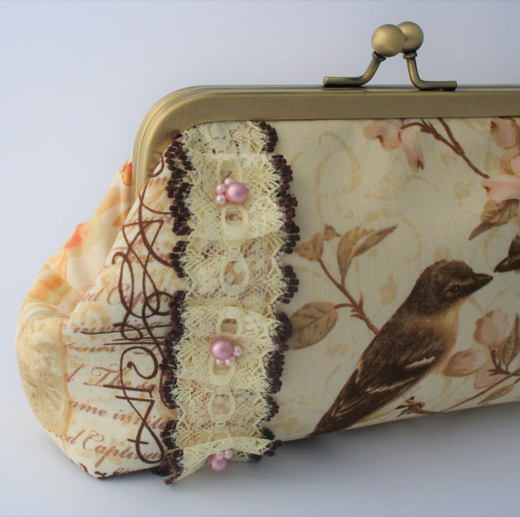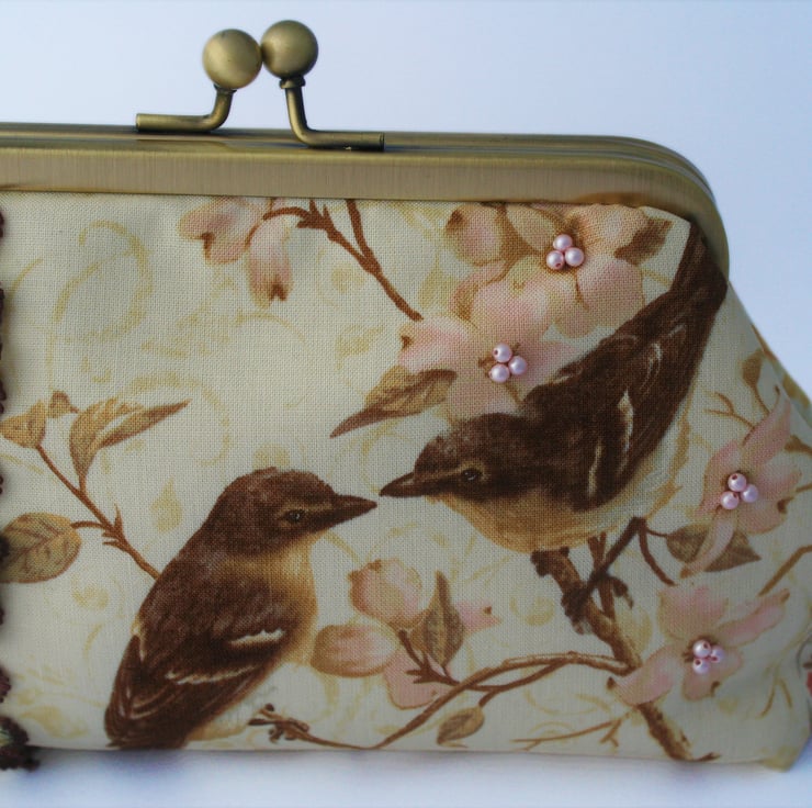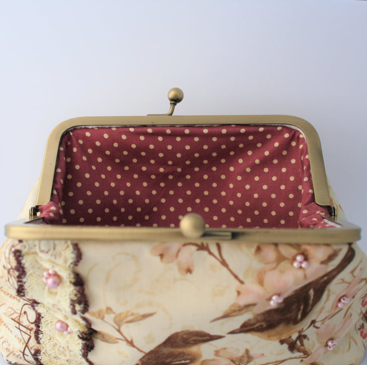 On the front of the purse two birds look ready to start nest-building while sitting in the branches of a cherry blossom tree. The centres of the blossoms around them are highlighted with clusters of tiny crystal pearl beads in a soft pink colour and a length of cream lace with brown edges is attached to the left hand side of the scene. The lace has been pleated and embellished with more clusters of crystal pearl beads.