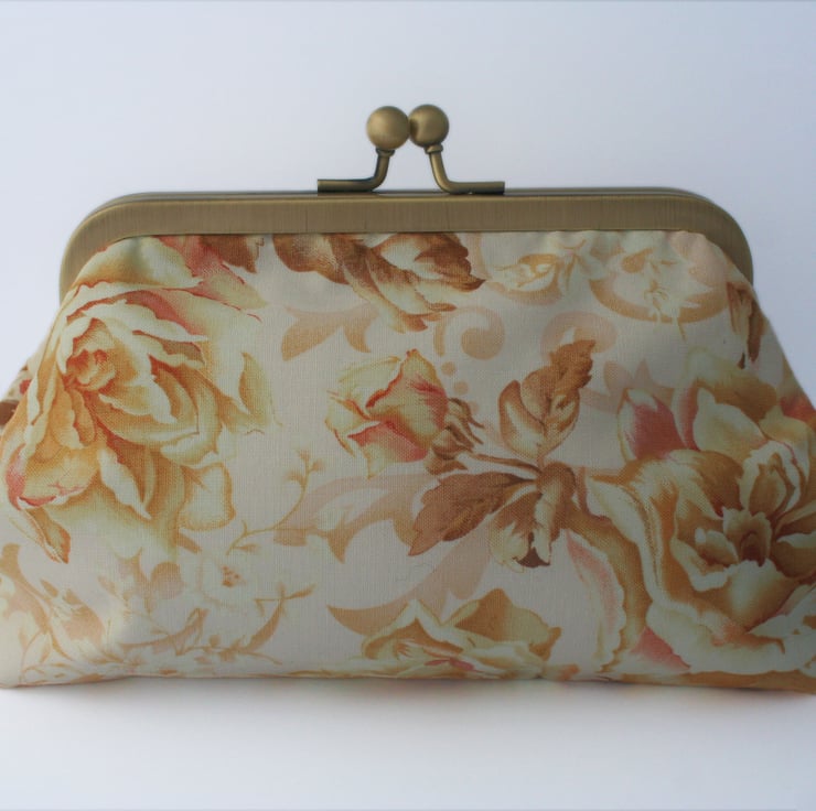 This is a one-of-a-kind clutch purse with an antique bronze kiss lock frame. I wanted to create something very romantic in a soft vintage style that would be perfect for a wedding or a special party or night out.