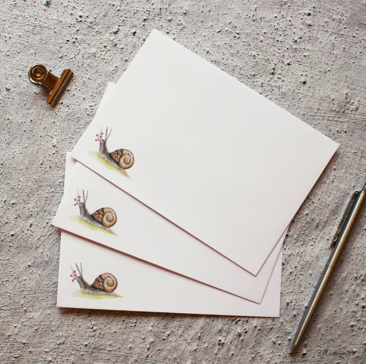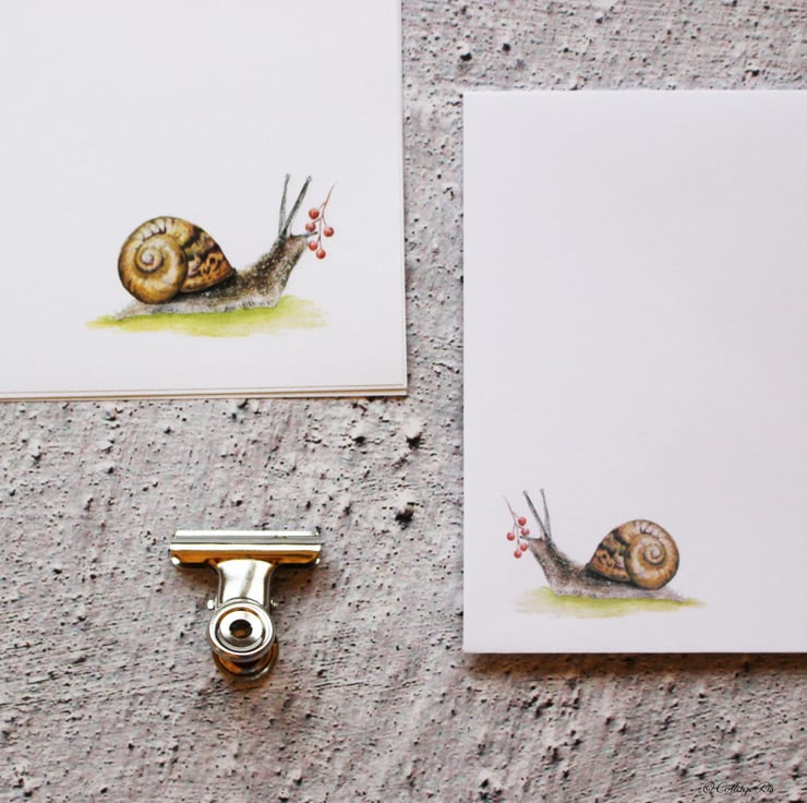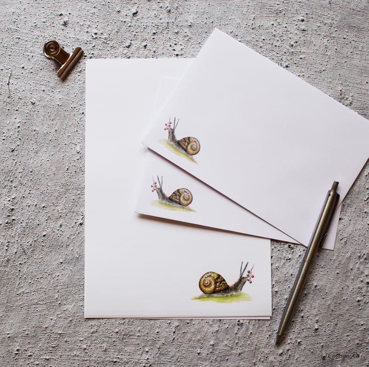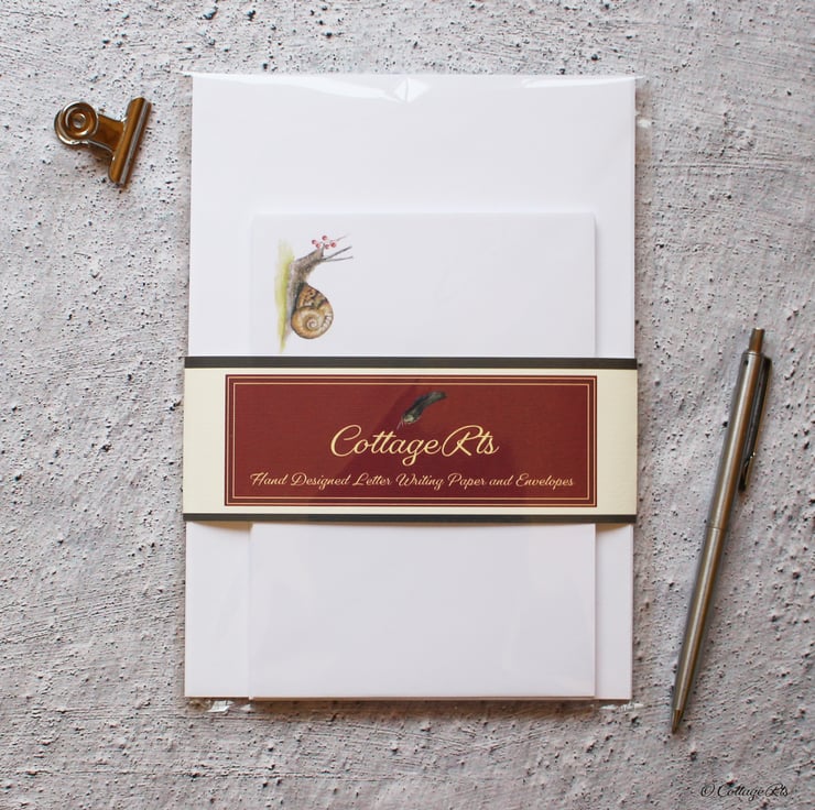 The snail for this design was originally hand drawn and painted by us at CottageRts, using coloured pencil and watercolours, before being digitally printed in to letter writing paper and envelopes.