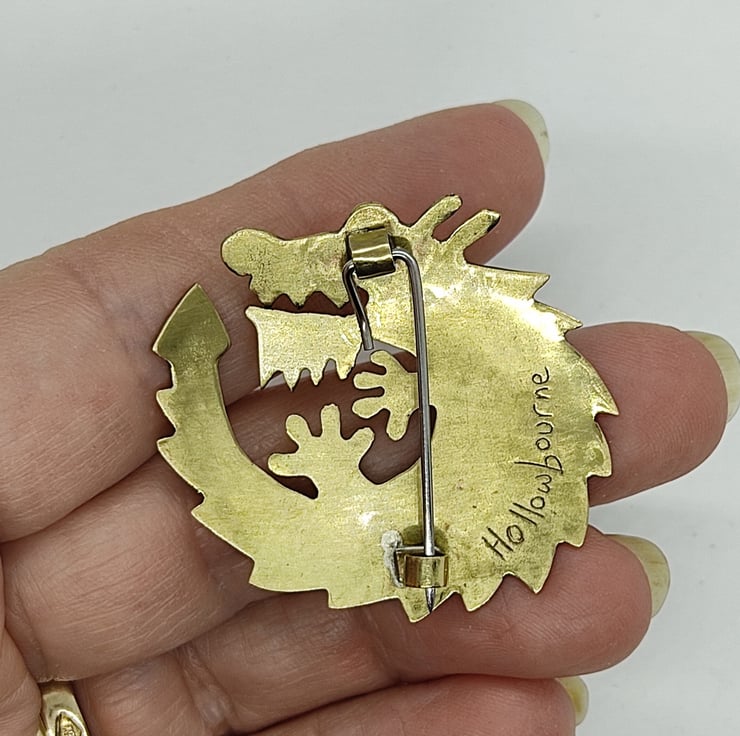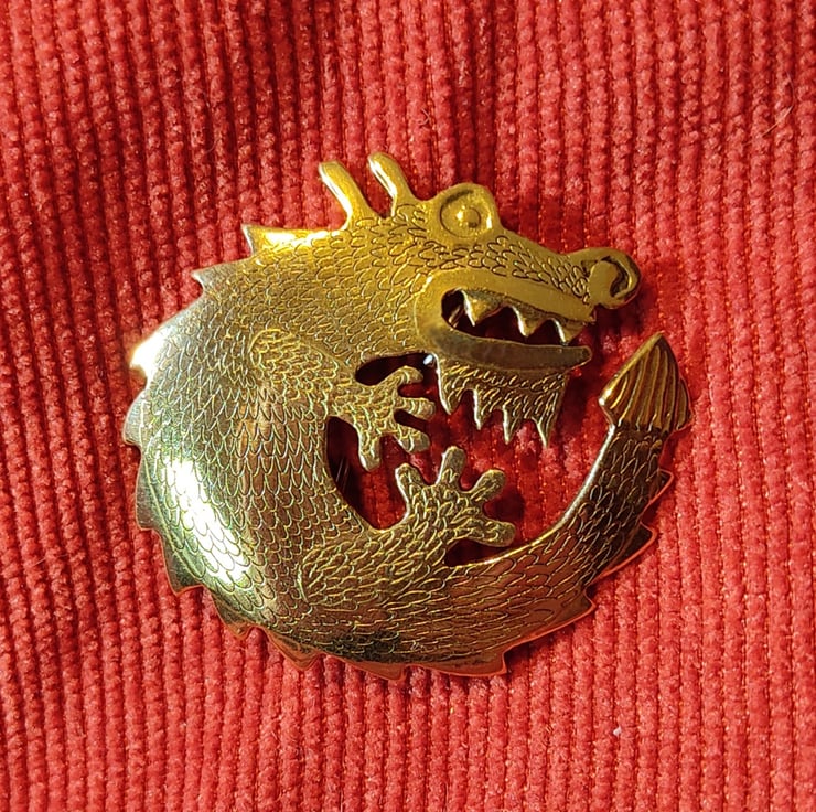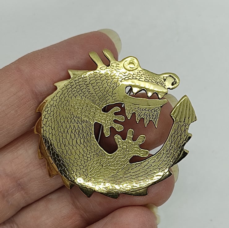 Small etched brass dragon , curled up in a ball. His scaling is all drawn by hand. I realised when I made this one that all the other baby dragons I have made before were copper,. so just for a change here is a brass one! I have signed him with Hollowbourne on the back.