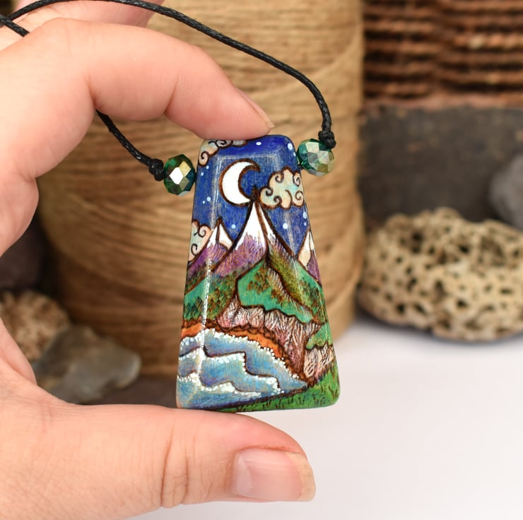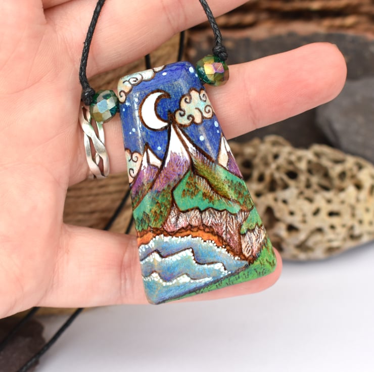 A moonlit landscape with snowy mountains, a beach and lush forests. Hand burned using pyrography and coloured with prismacolor pencils.It would make a great birthday or wood anniversary gift, especially for an adventurer, walker, hiker or rambler.