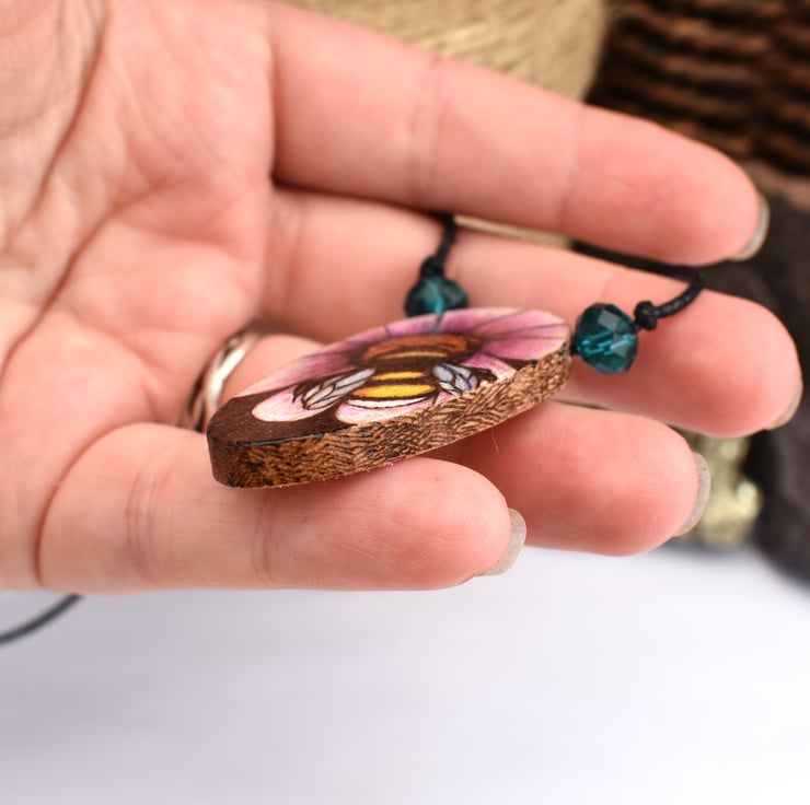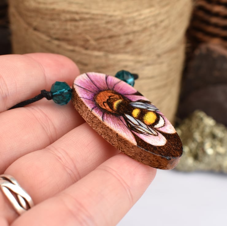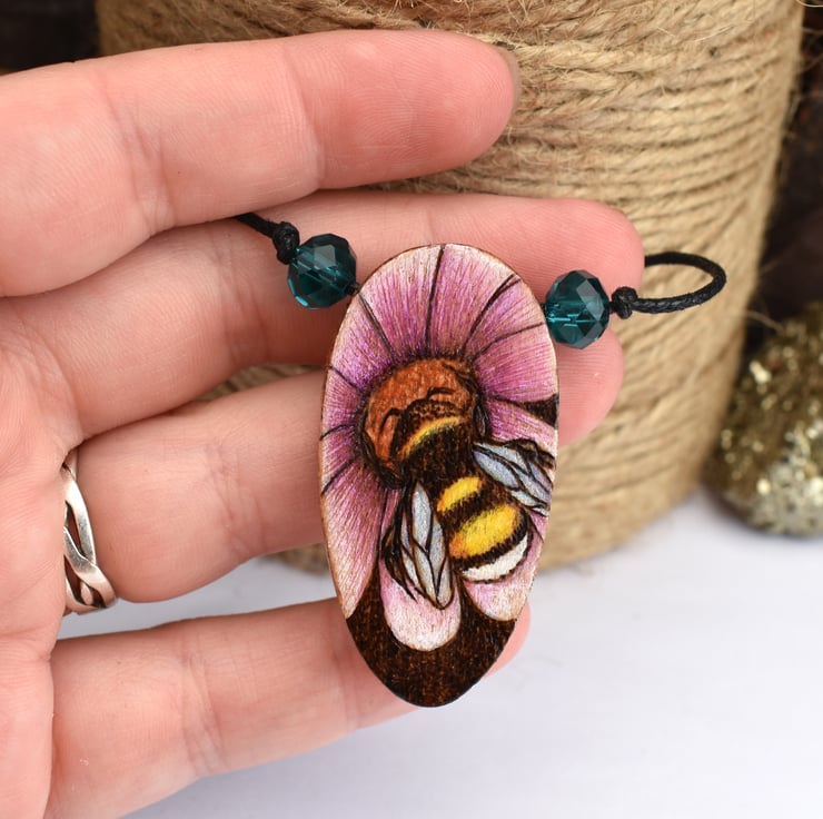 A lovely hand burned pyrography bumblebee pendant with vibrant prismacolor .Ideal nature lover gift, bee lover or a fab idea for a wood anniversary gift.
