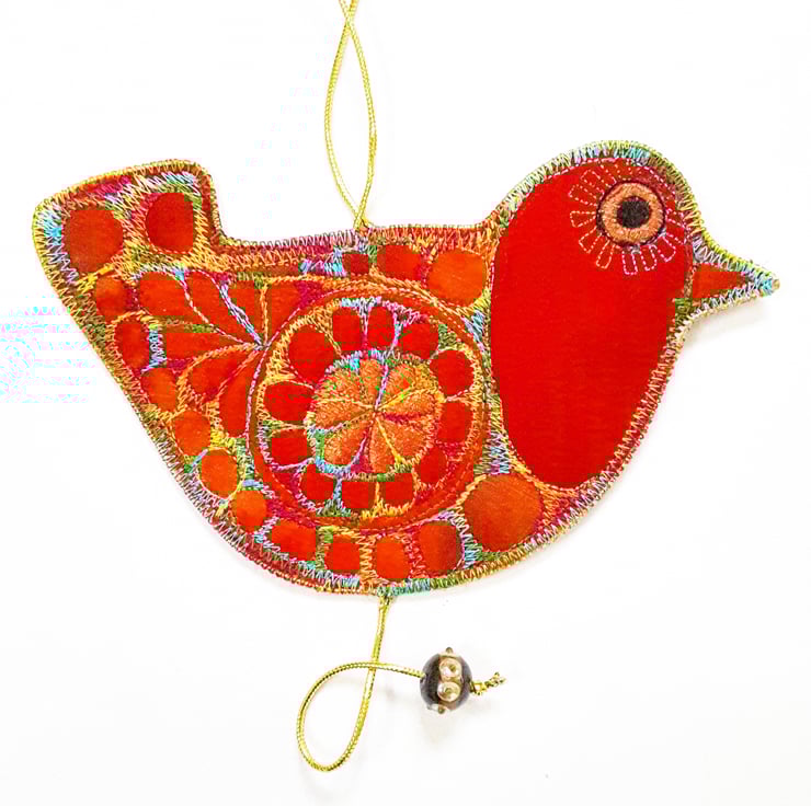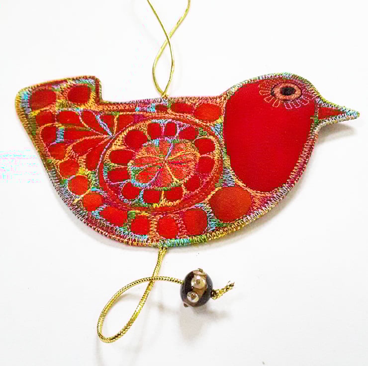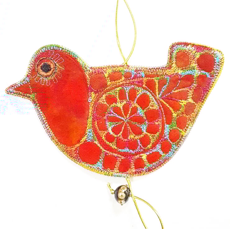 It has a gold loop to hang it from and a gold thread with one of my own handmade glass beads hanging from the bottom of it.