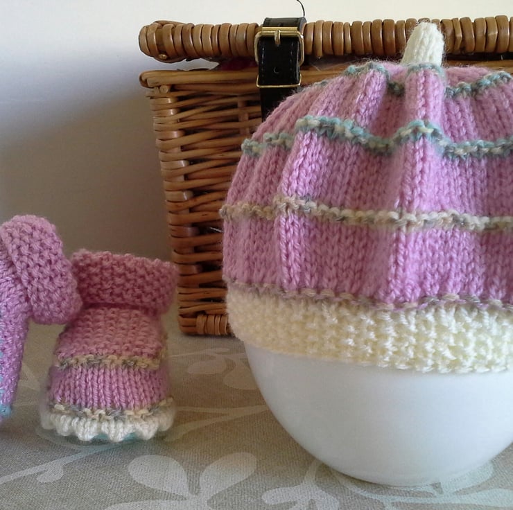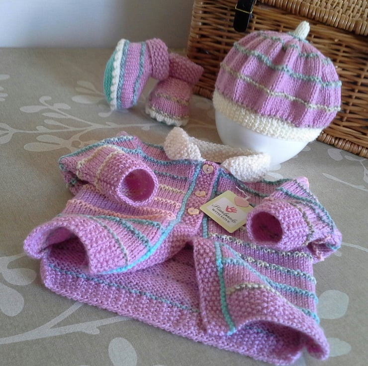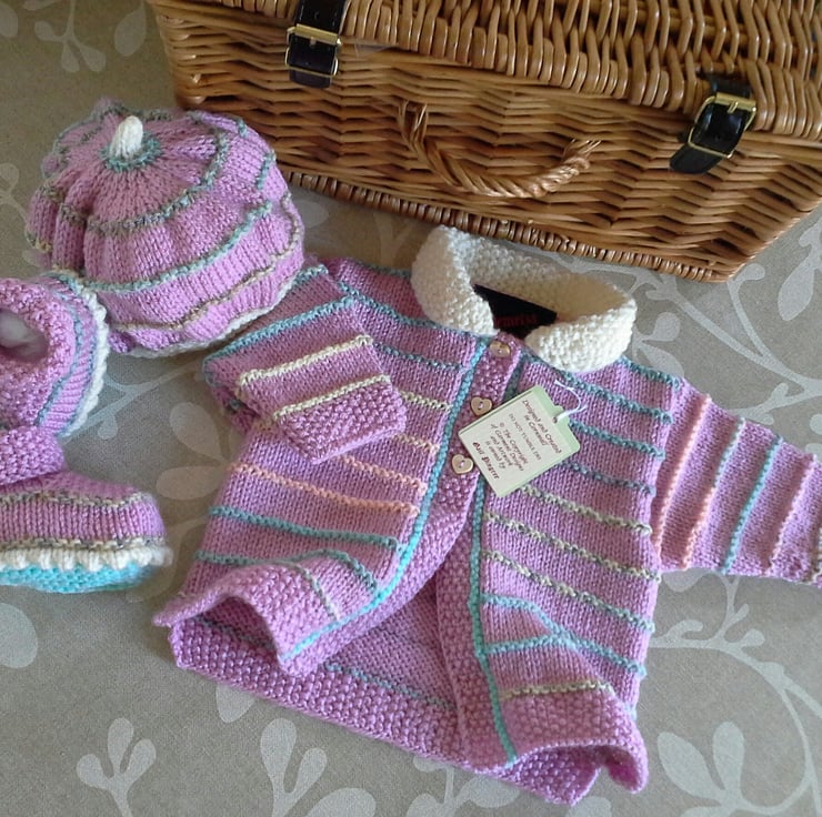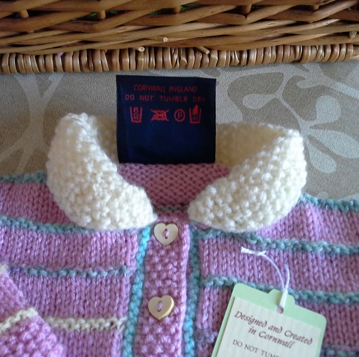 A very pretty unique baby girl's layette set designed and totally hand crafted to an exceptional standard one would expect from a professional craft designer. This set would make a perfect newborn or baby shower gift if the sex is known my the expectant mother. The branded designer garment label is attached to the back neck edge of the jacket with the care instructions woven within for lasting reference and proof of it's origins if gifting.
