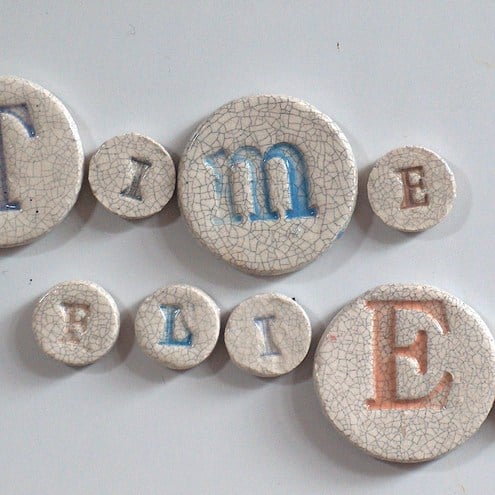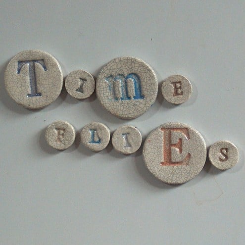 Individually handmade ceramic fridge magnets, reading "Time Flies". Each letter is stamp with my vintage stamps, and coloured using lovely coloured under glaze, then finished in my trade mark crackle glaze. The magnets come packaged with lovely vintage style paper baccking.