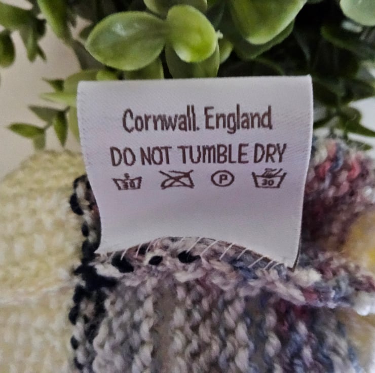 Baby knitwear is designed and hand crafted by Demelza Designs in Cornwall meeting UK baby safety standards, Only branded premuim acylic, acrylic/natural fibre blends or pure natural fibre yarns are used in baby knitwear which conforms to BS984/76 standards.