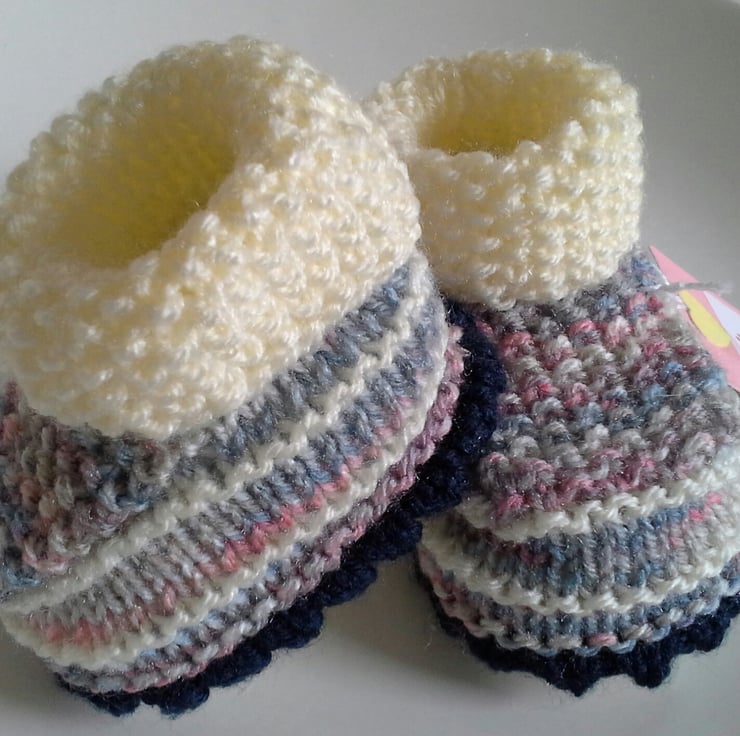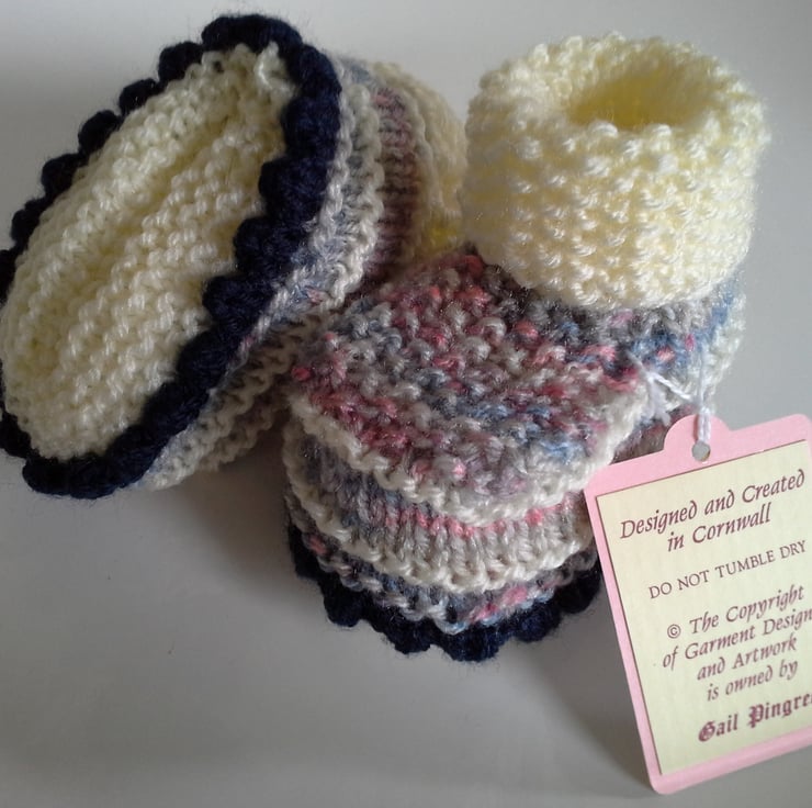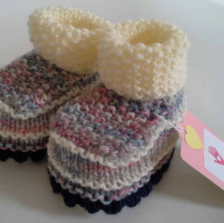 A lovely pair of practical booties for a baby girl to keep those little delicate toes and feet cosy and warm. They have been designed and totally hand crafted by the designer. The booties are nice and wide with a good depth to be worn over socks, tights or leggings. They will be ideal as token quality gift or for a baby shower event if the sex of the baby is known.