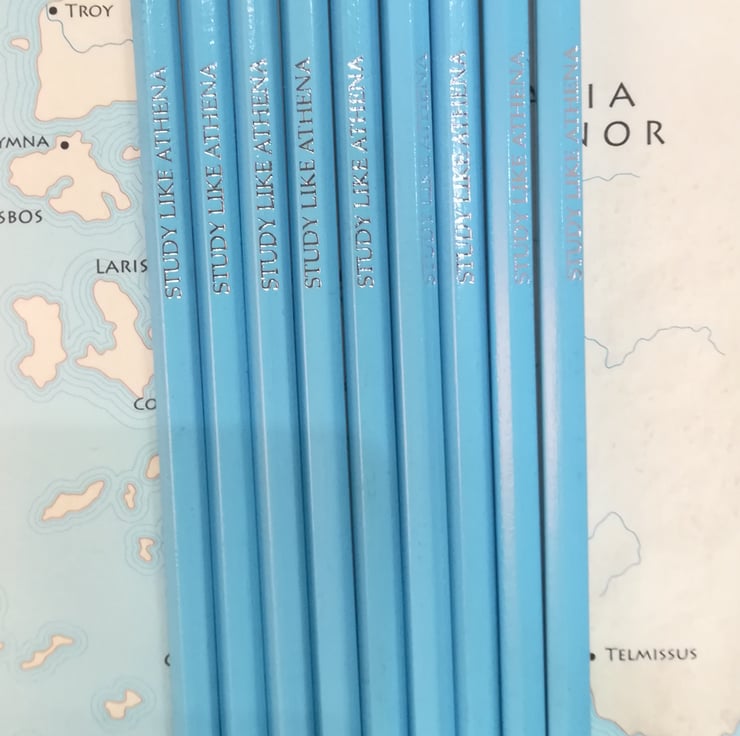 Pencil is sky blue with a white eraser and reads 'Study Like Athena' in silver foil.