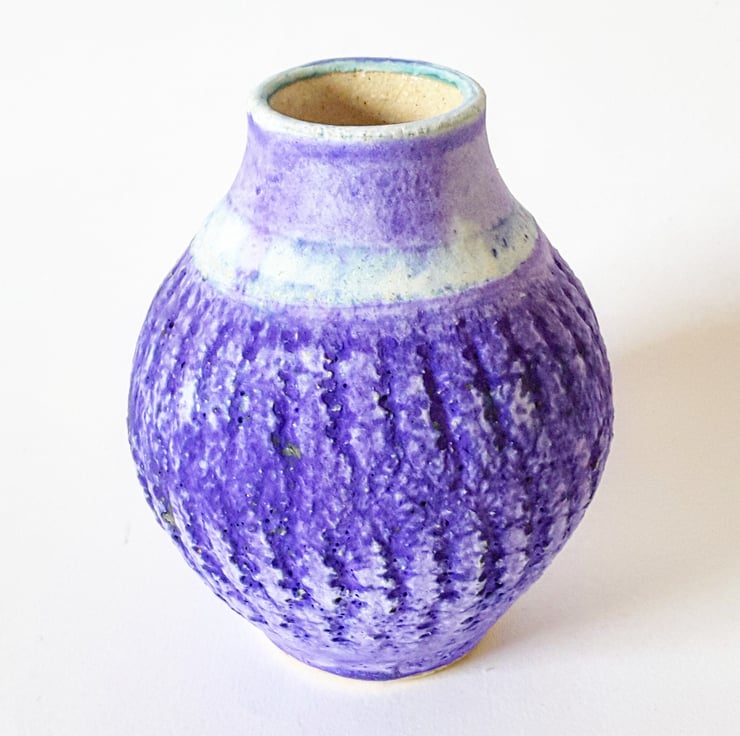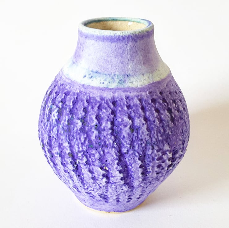 Glazed in matt blue glaze with a shiny clear glaze on the inside of the vase and it has a pattern incised on the main body of the pot.