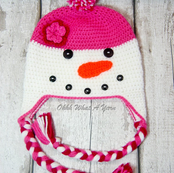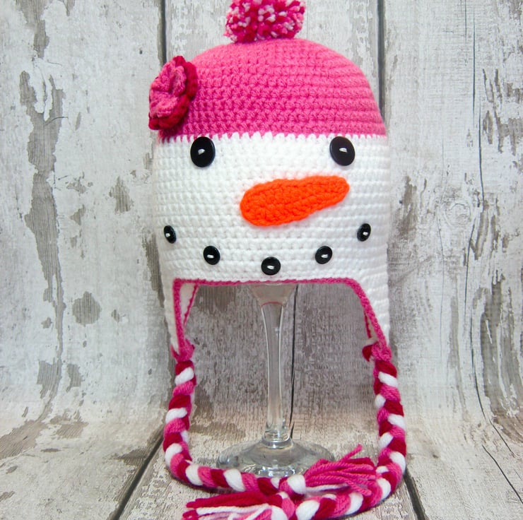 The hat is crocheted using white, dusky pink and cerise pink yarns.The eyes and mouth (coal) are made using black buttons and she has a crochet carrot for her nose.