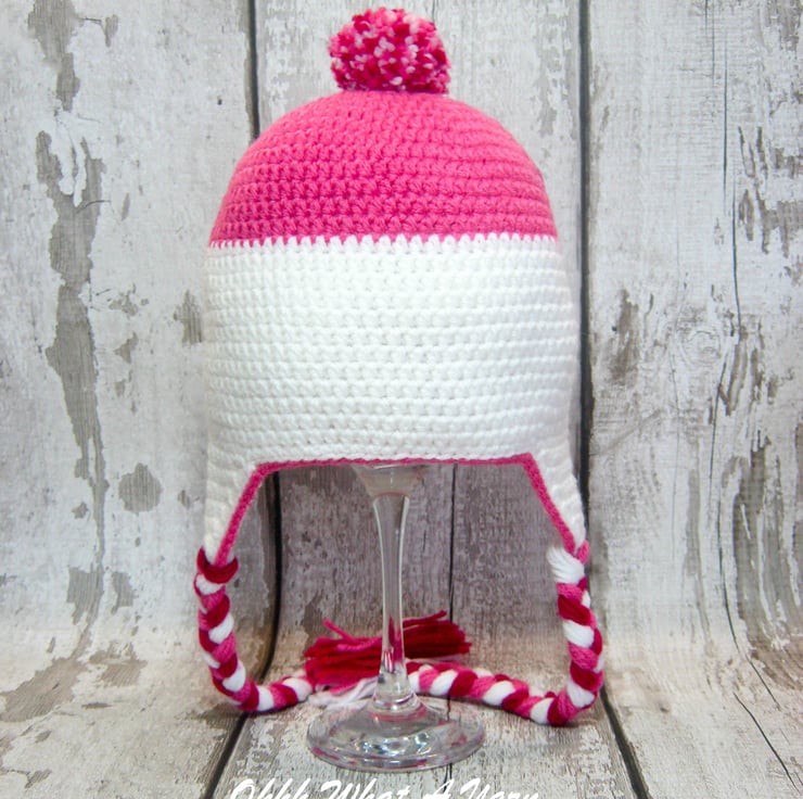 She has crochet ear flaps and plaited ties with tassels and a lovely pom pom on her hat.