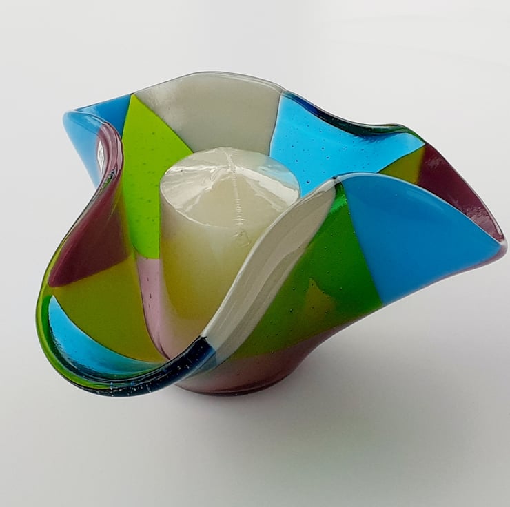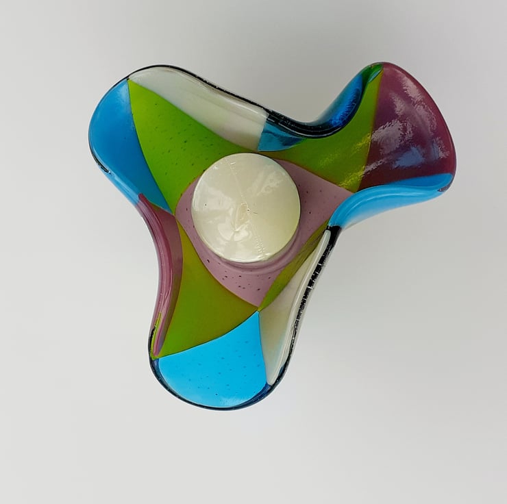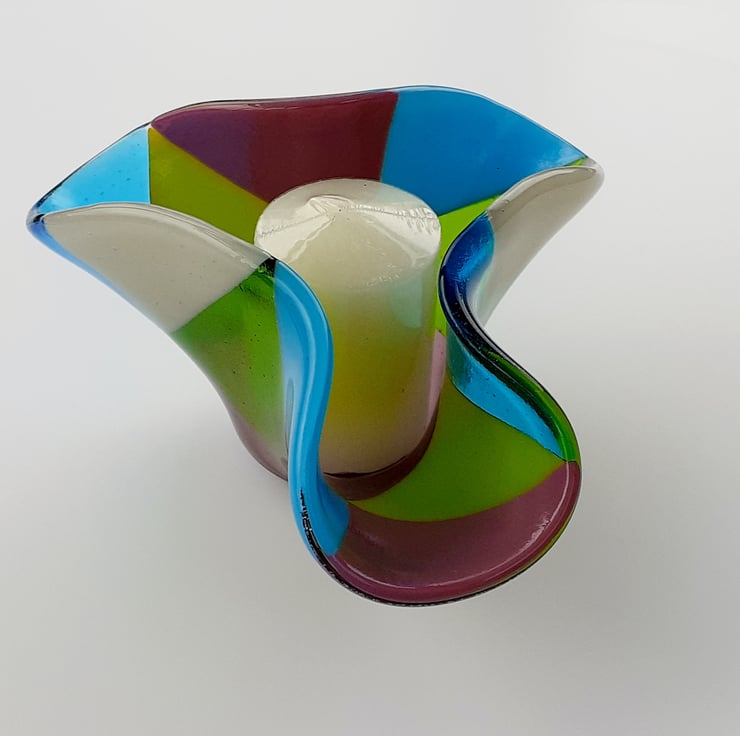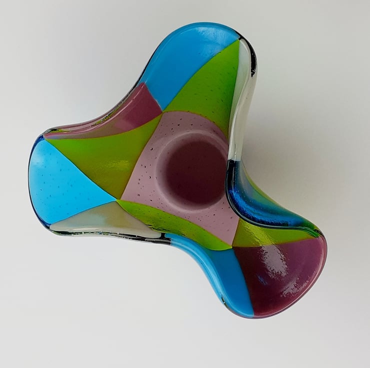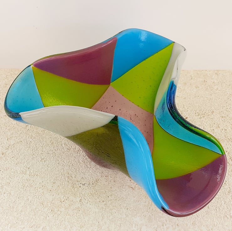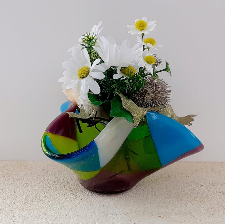 This fused glass ornamental vase was made from a selection of transparent and opaque art glass in mixed shades, cut into triangles and kiln-fused together to a smooth finish. The piece was then 'draped' over a mould and fired again at a lower temperature which results in the lovely free-form organic edges. The vase looks different depending on which side it is viewed from.