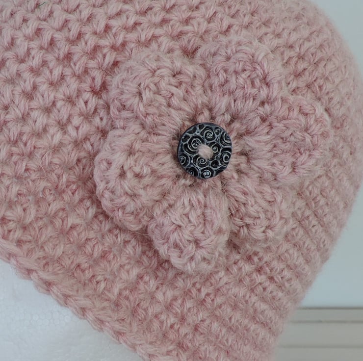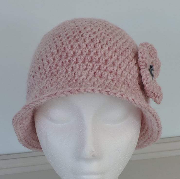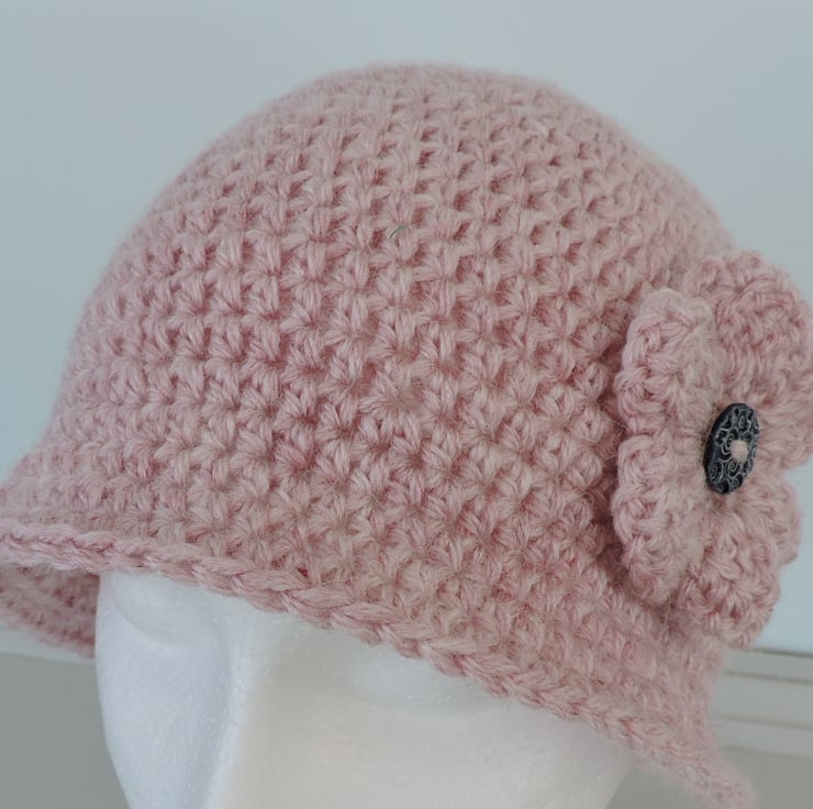 A pretty pale pink crochet cloche style hat in a warm and cosy chunky alpaca and acrylic yarn. The hat is finished with a crochet flower, and an beautiful dark grey ceramic button from Sarah at Dottery Pottery.