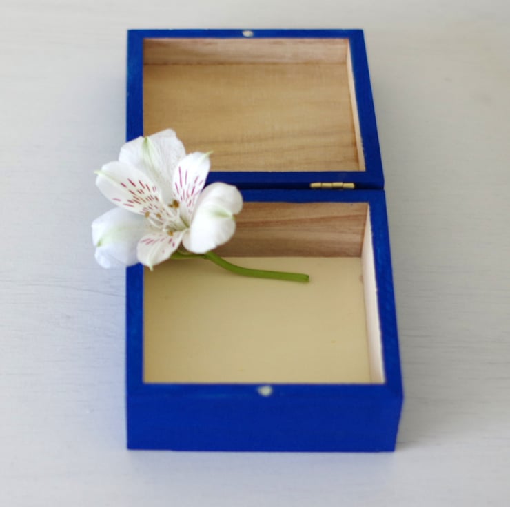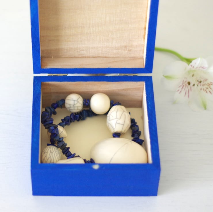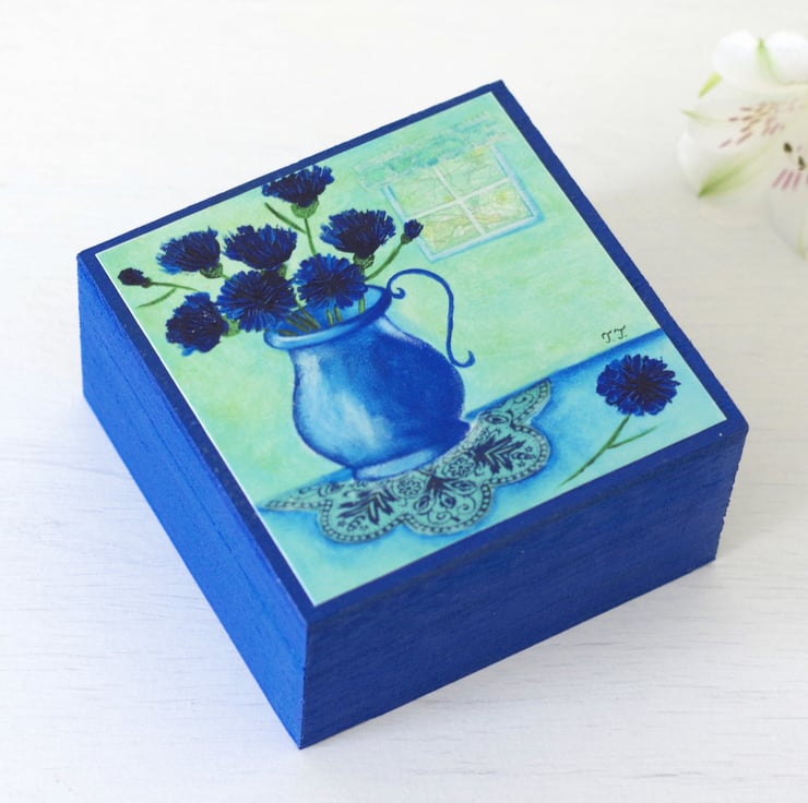 I made this blue trinket box by hand-painting a plywood box with electric blue acrylic paints and then mounting a print after one of my original still life mixed media painting on top. The design resembles cornflowers in a blue vase. The box measures approx 4.3" x 4.3" and 2.4" high. It is perfect as a pretty gift box or to store small items and jewellery. To be handled with care.