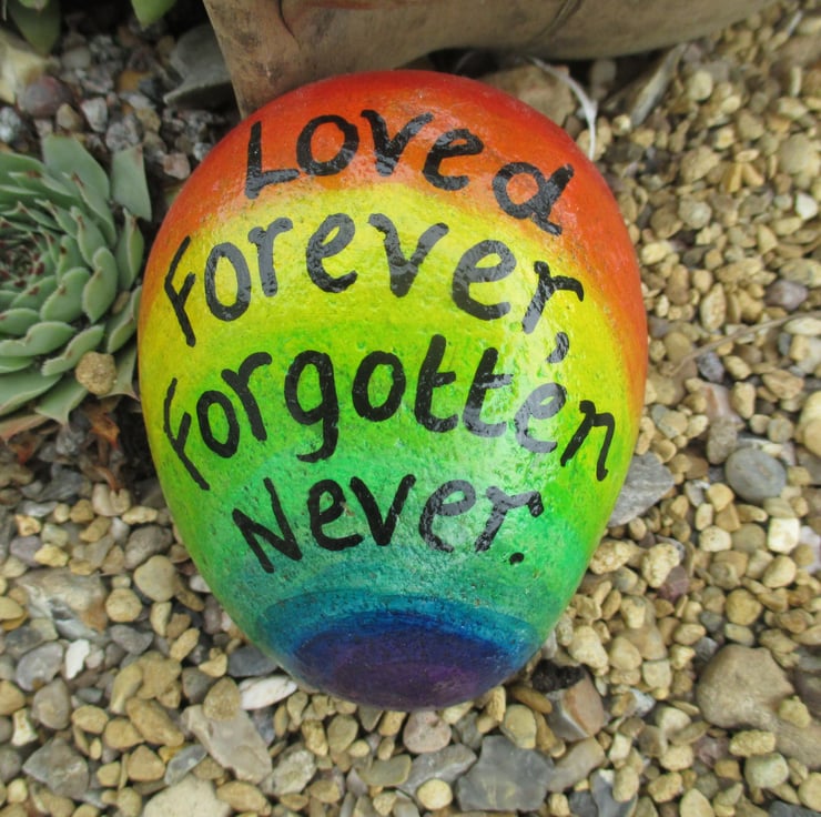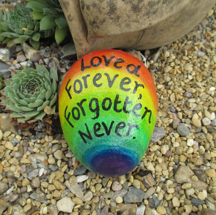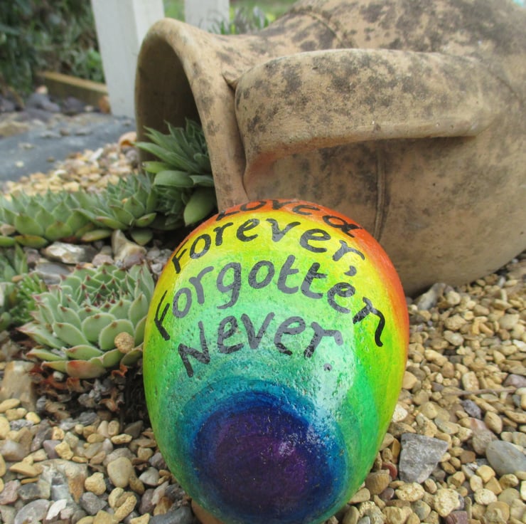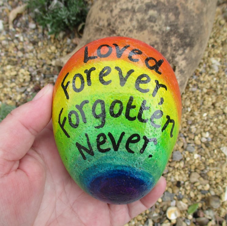 This is a hand painted memorial stone, painted with a rainbow background and the text 'Love Forever, forgotten never'.