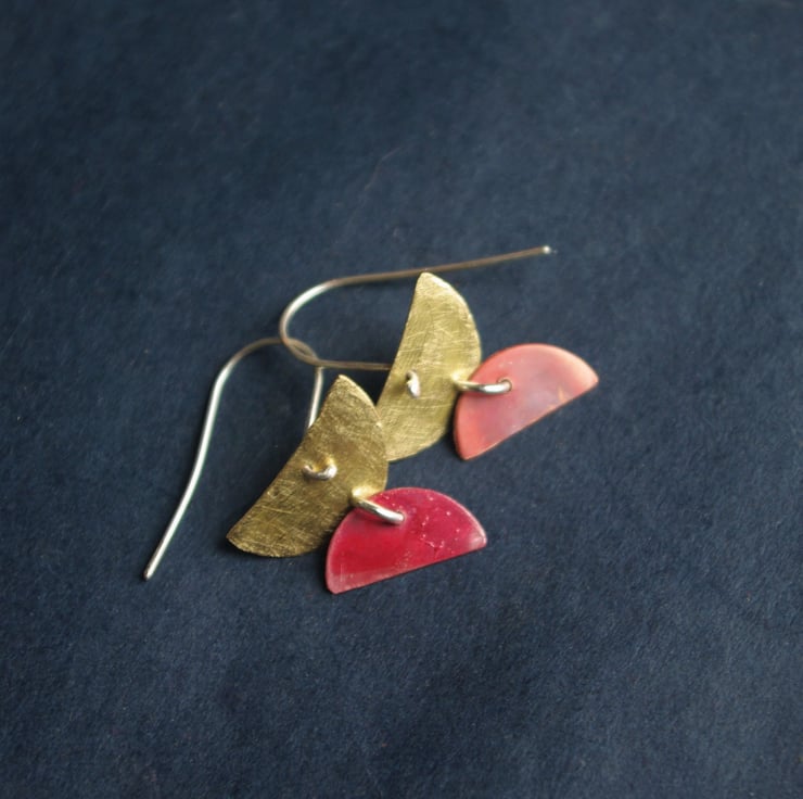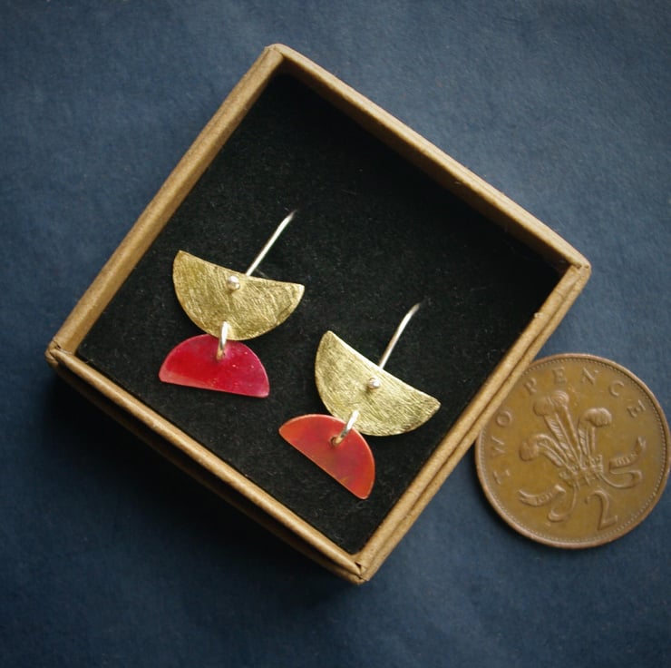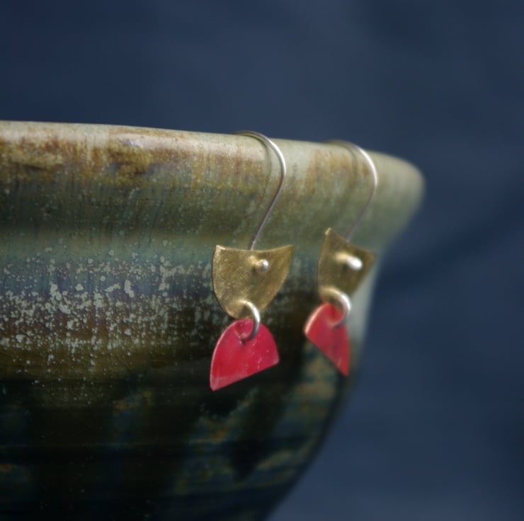 I have made rough semi circles from brass and copper and hung them from a handmade sterling silver earhook. The brass arc shape is 18mm/ 0.75 inches across. The copper arc is smaller and has been given a luscious shade of red with a technique using heat . The copper pieces hang at a slight quirky angle as seen in the first photo.