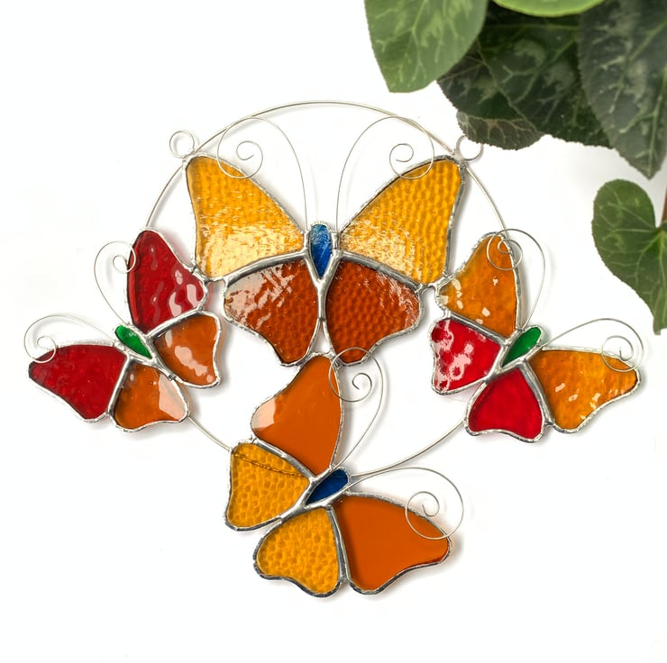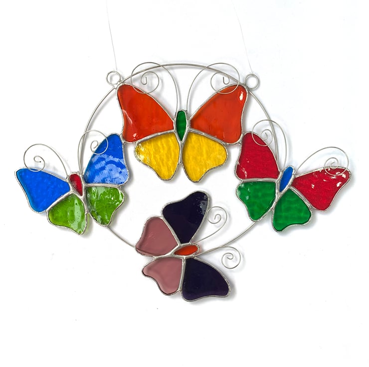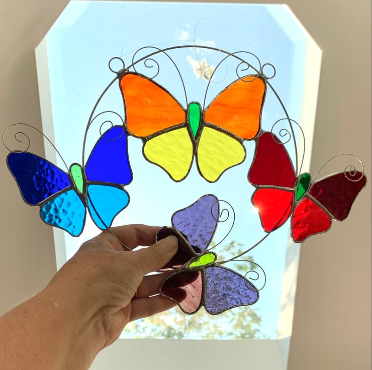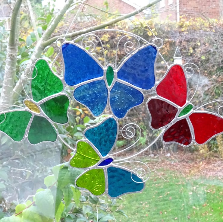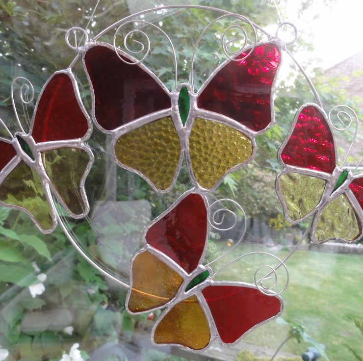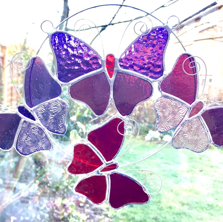 This suncatcher consists of four butterflies all made from colours of your choice, whatever colours you choose I can assure you they will be beautiful with interesting textures, just drop me an email to let me know what colours you would like.